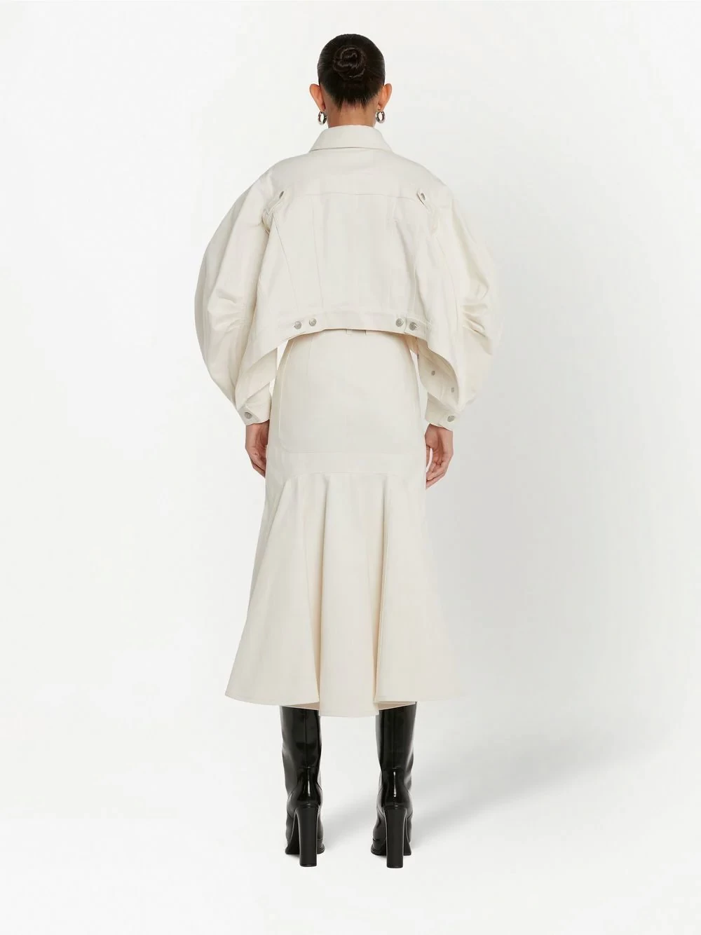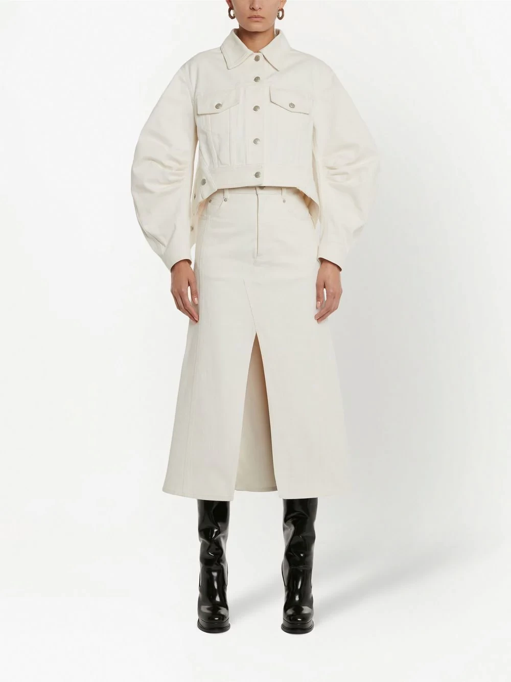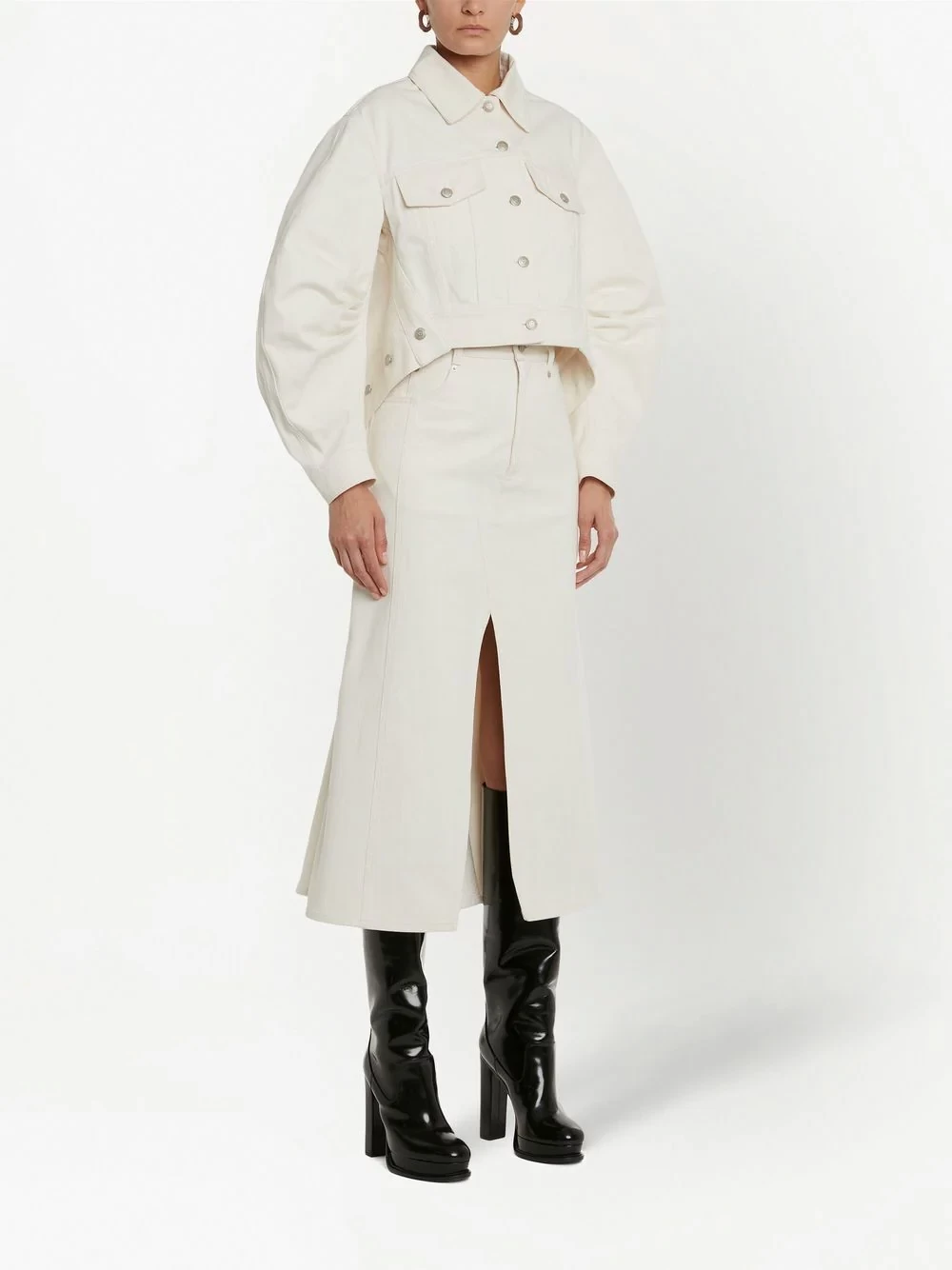featuring ivory white, cotton, denim, front slit, ruffled detailing, high waist, belt loops, A-line, concealed fly and button fastening and three front pockets.