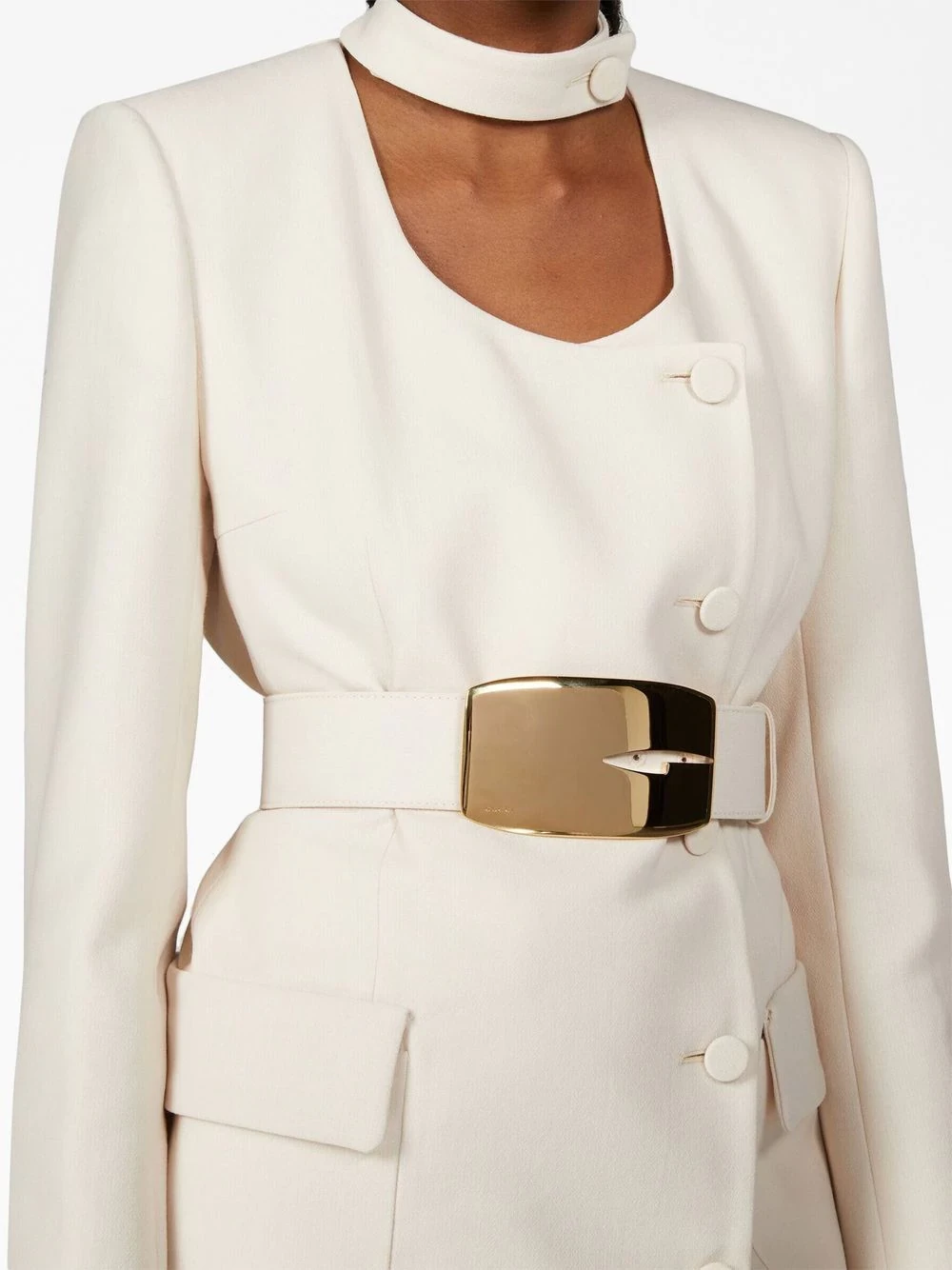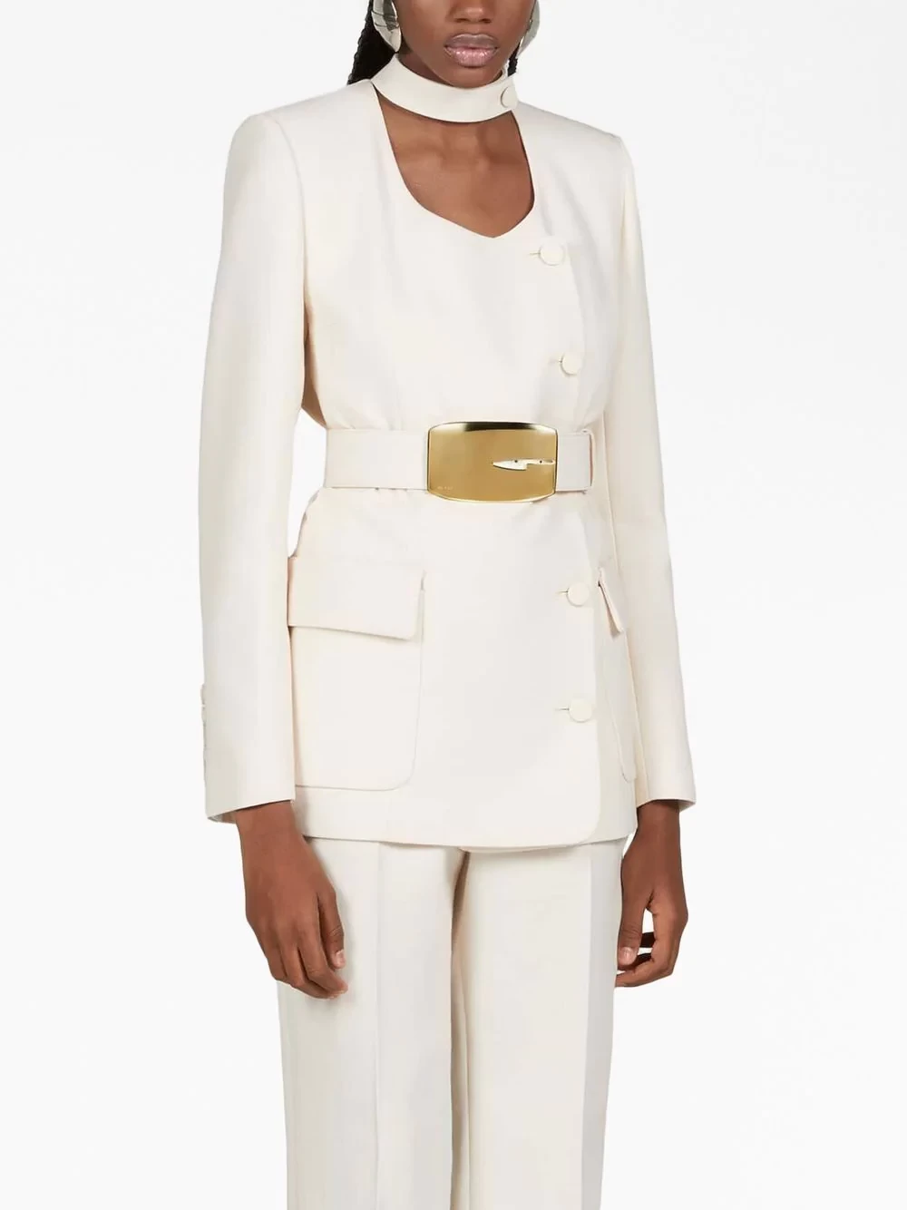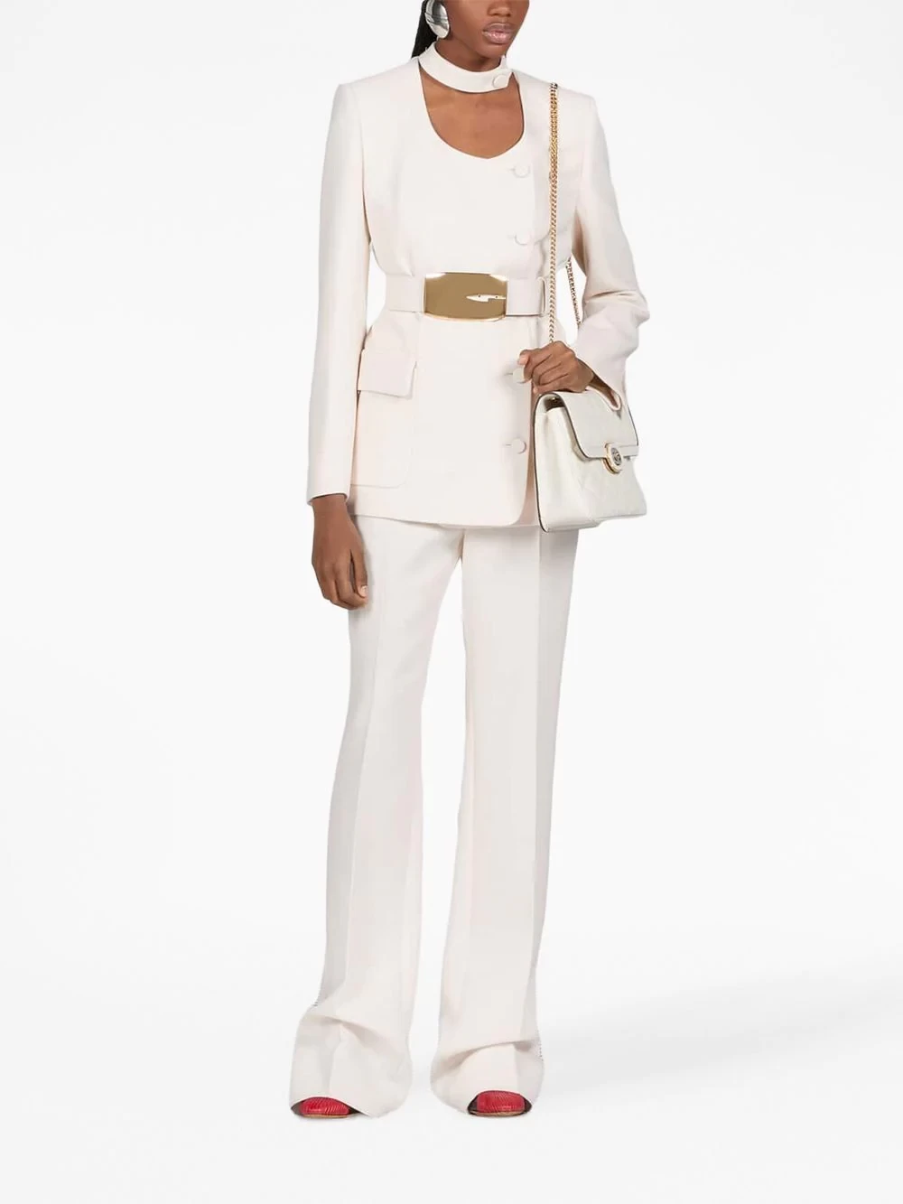Displaying Gucci's timeless style, this blazer is spun from wool in a tonal white colourway which is highlighted by a detachable waist belt adorned with a gold-tone buckle for an eye-catching finish.