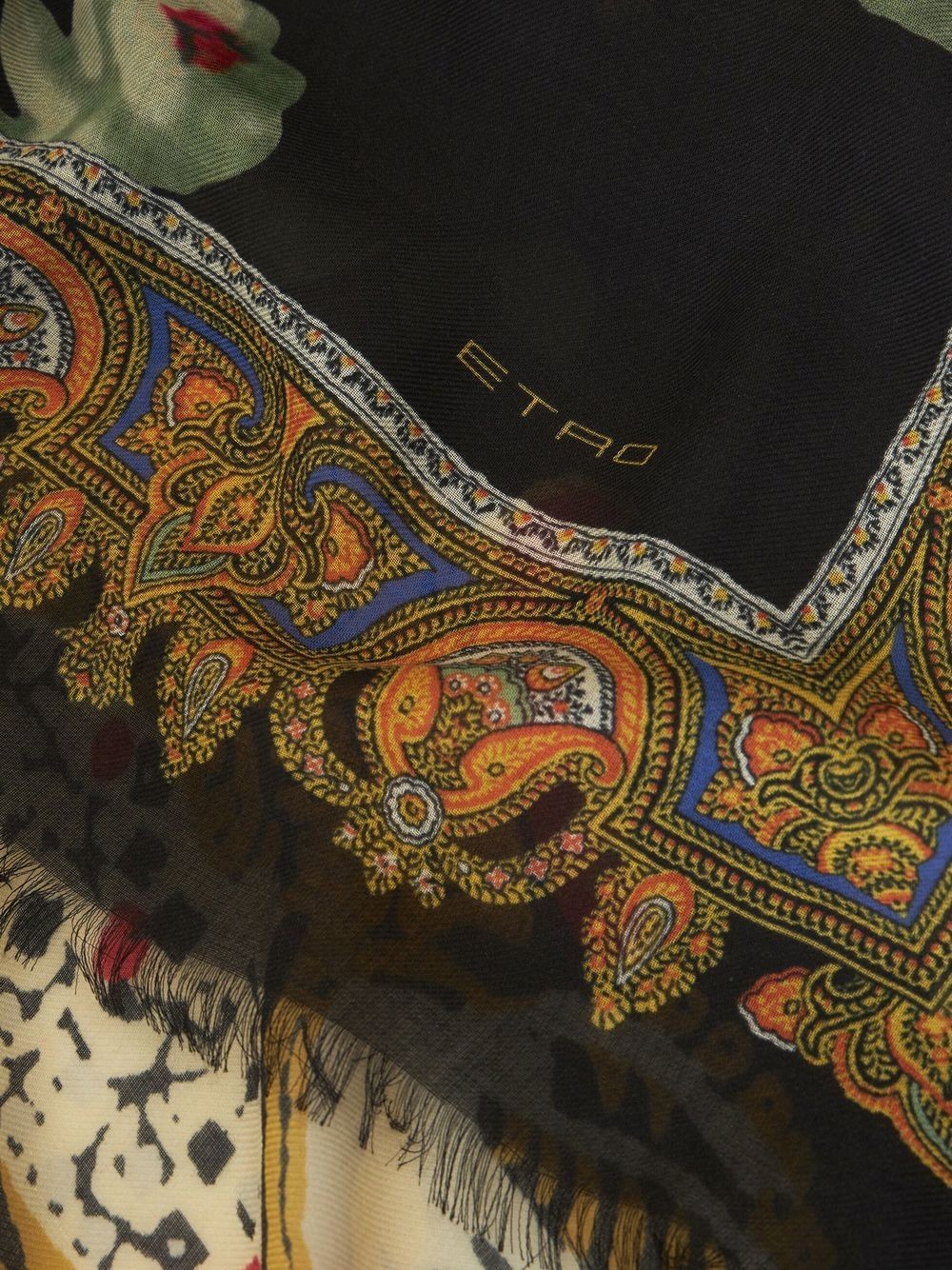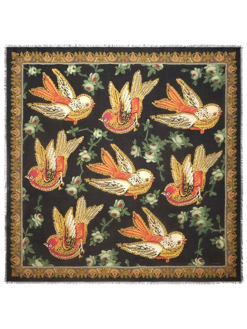 bird-print shawl from ETRO featuring black/multicolour, modal, cashmere blend, fine knit, all-over graphic print, square shape and frayed edge. Conscious: This item contains at least 50% low-impact materials, which are certified or widely recognised as having a lower environmental impact..