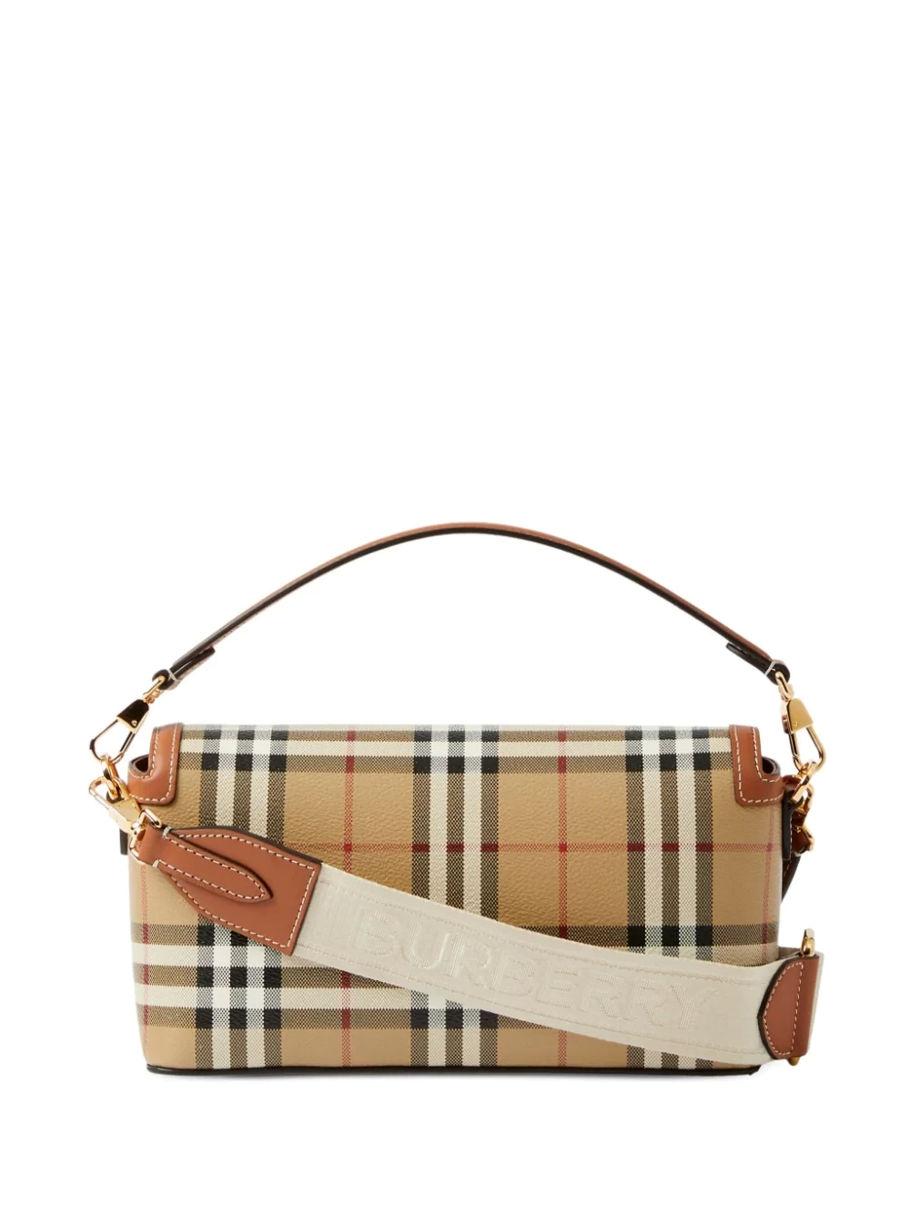 Cotton/leather, check pattern, gold-tone logo plaque, gold-tone hardware, front flap closure, magnetic fastening, main compartment, single detachable top handle and detachable shoulder strap.