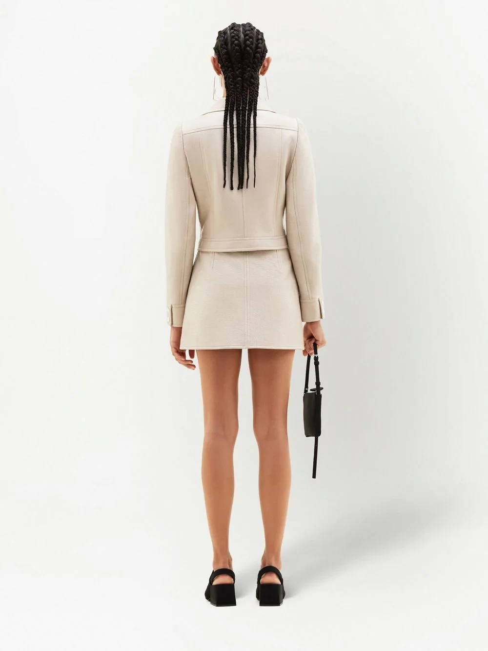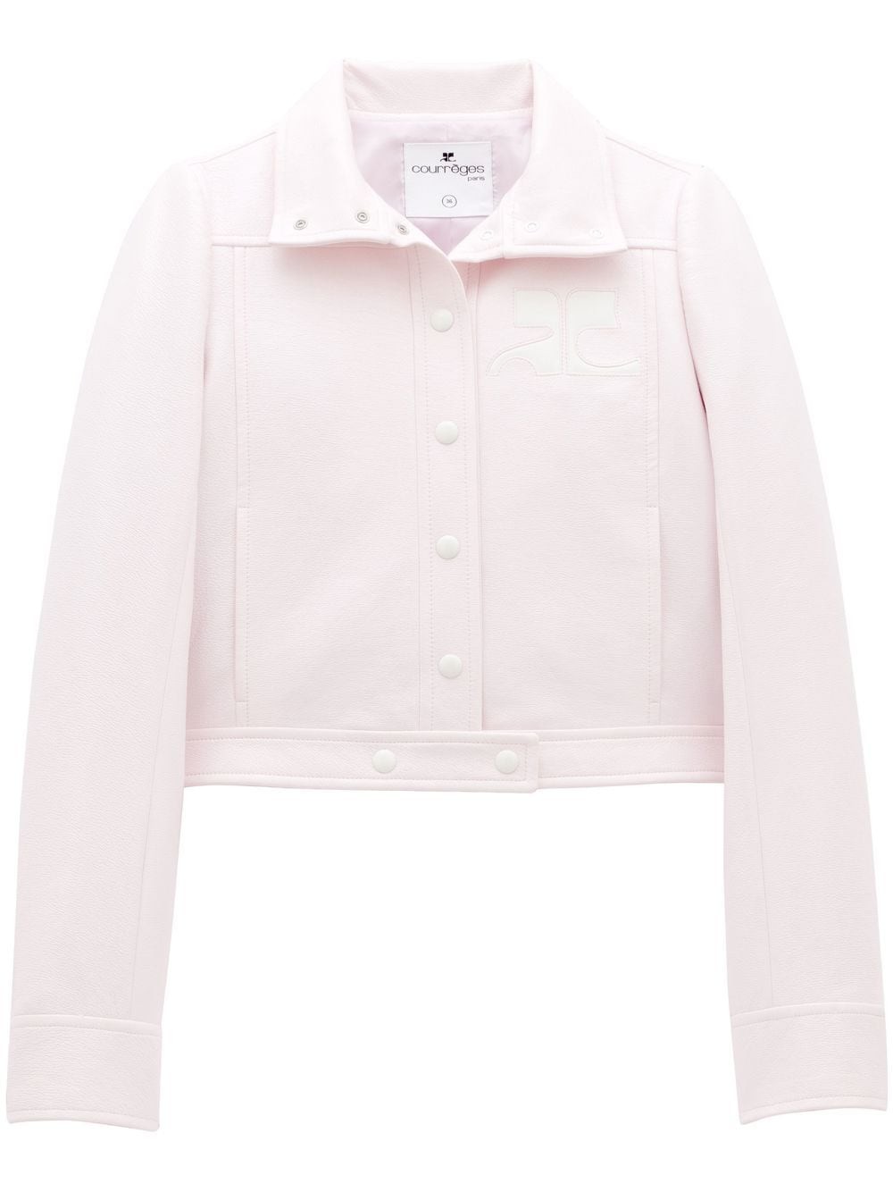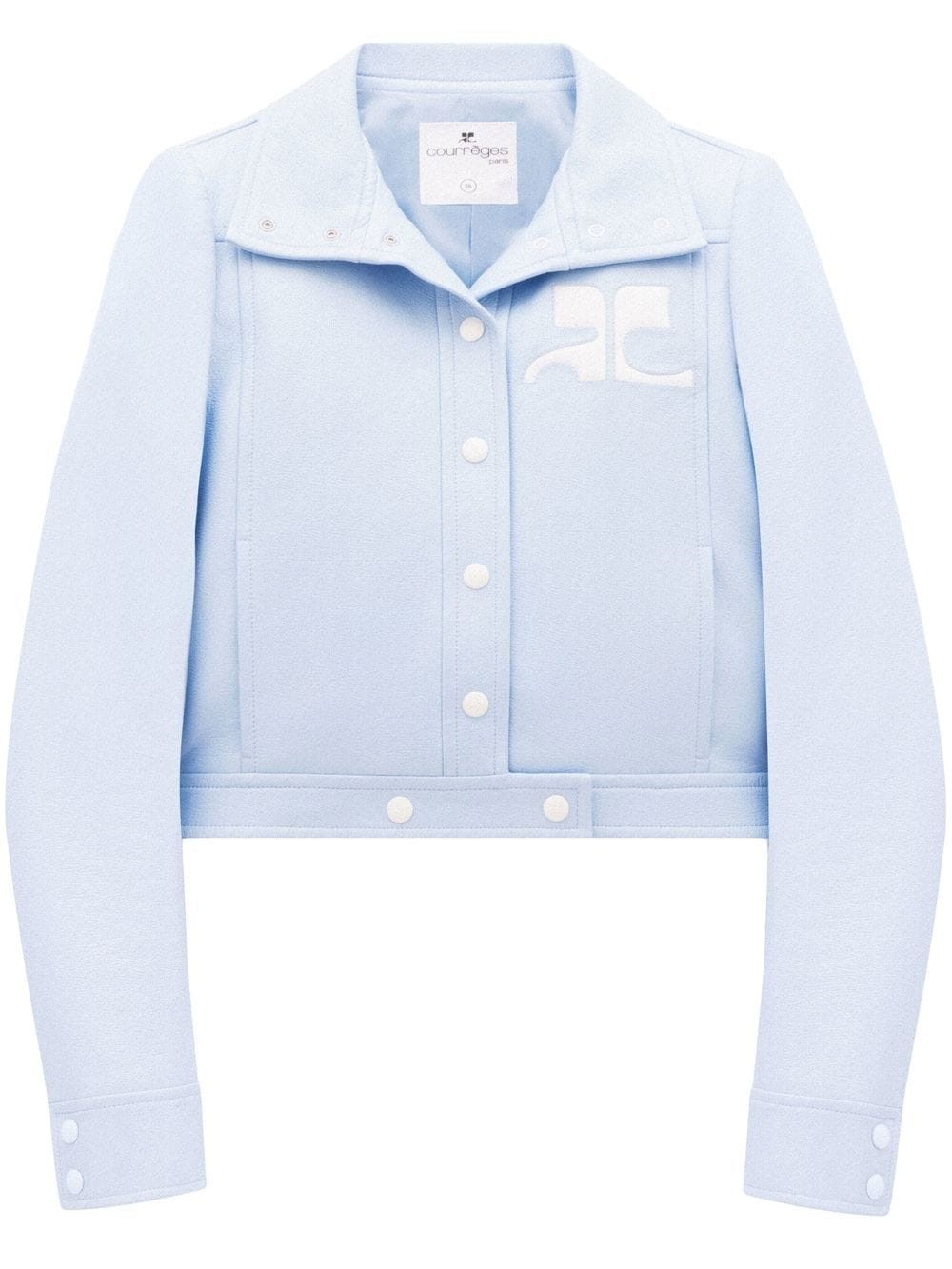 chest logo-patch shirt jacket from COURRÈGES featuring logo patch at the chest, spread collar, front press-stud fastening, long sleeves, two front welt pockets, sky blue and cotton.