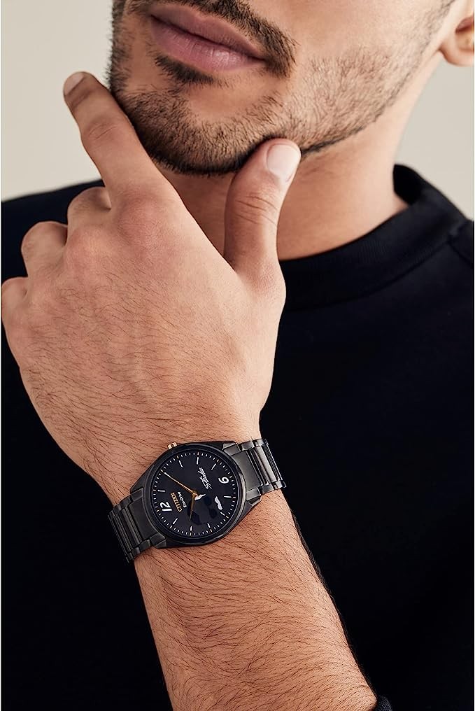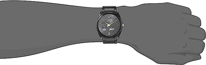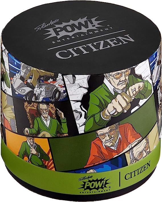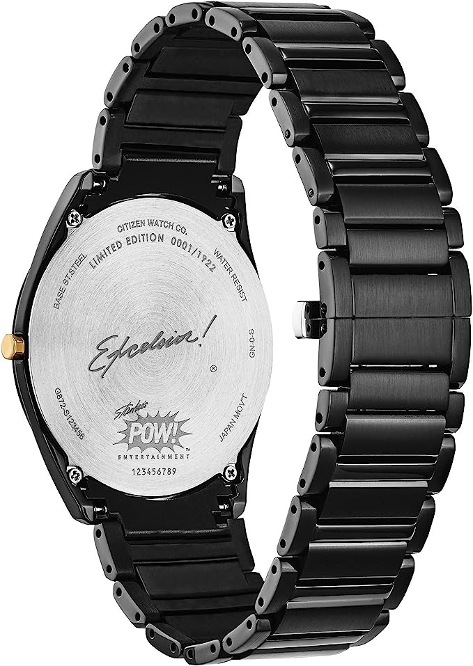 •   "Celebrate the ultimate Pop Culture icon with the release of a Limited Edition POW! Entertainment Stan Lee watch by CITIZEN. Limited to 1,922 pieces worldwide, the year Stan was born. Making a cameo in black ion-plated stainless steel, Stan’s silhouette and signature make this a fitting commemorative timepiece. Gold-tone accents and comicbook style fonts complement a black patterned dial. Featuring CITIZEN Eco-Drive technology – it’s powered by any light and never needs a battery.