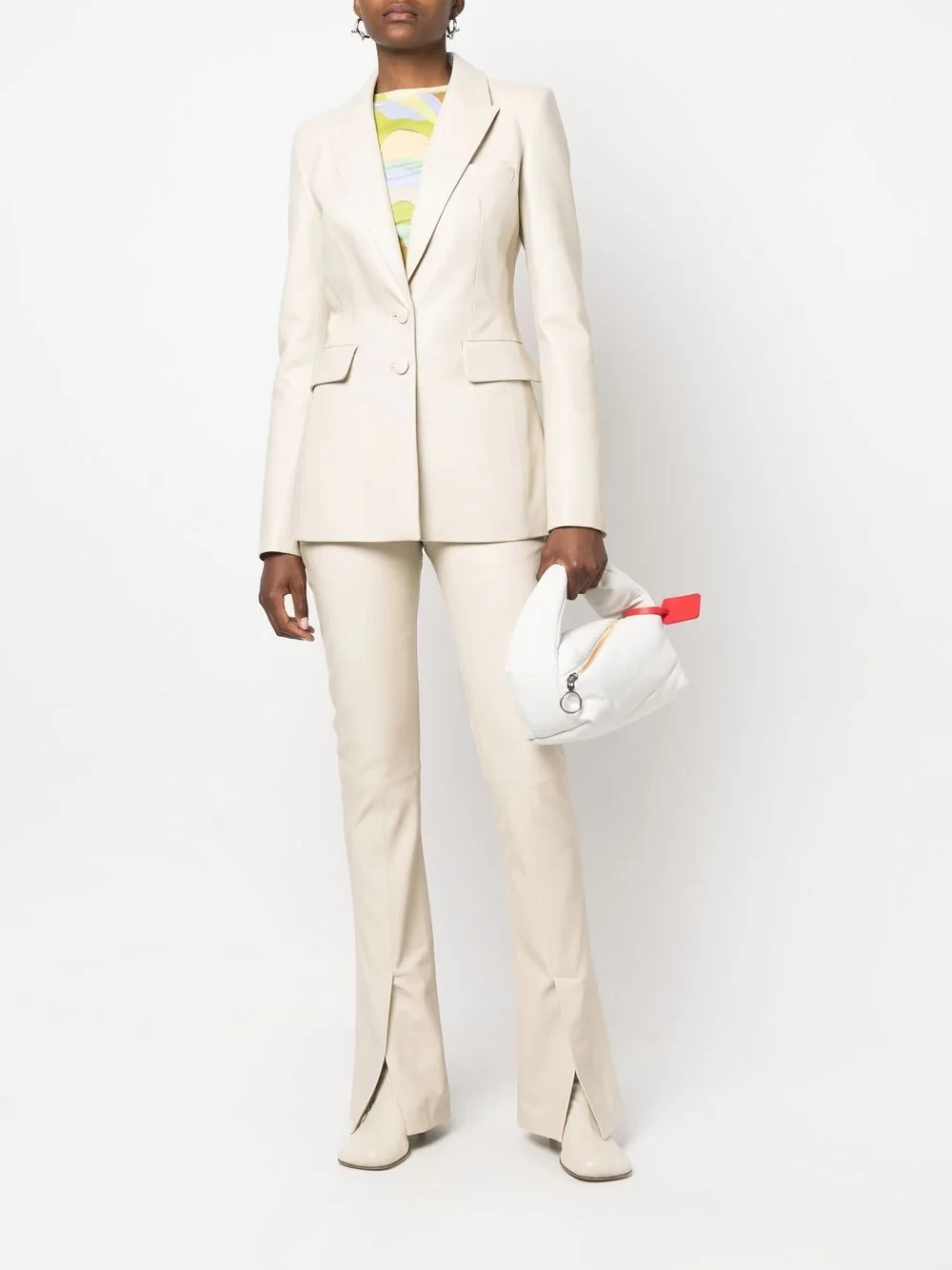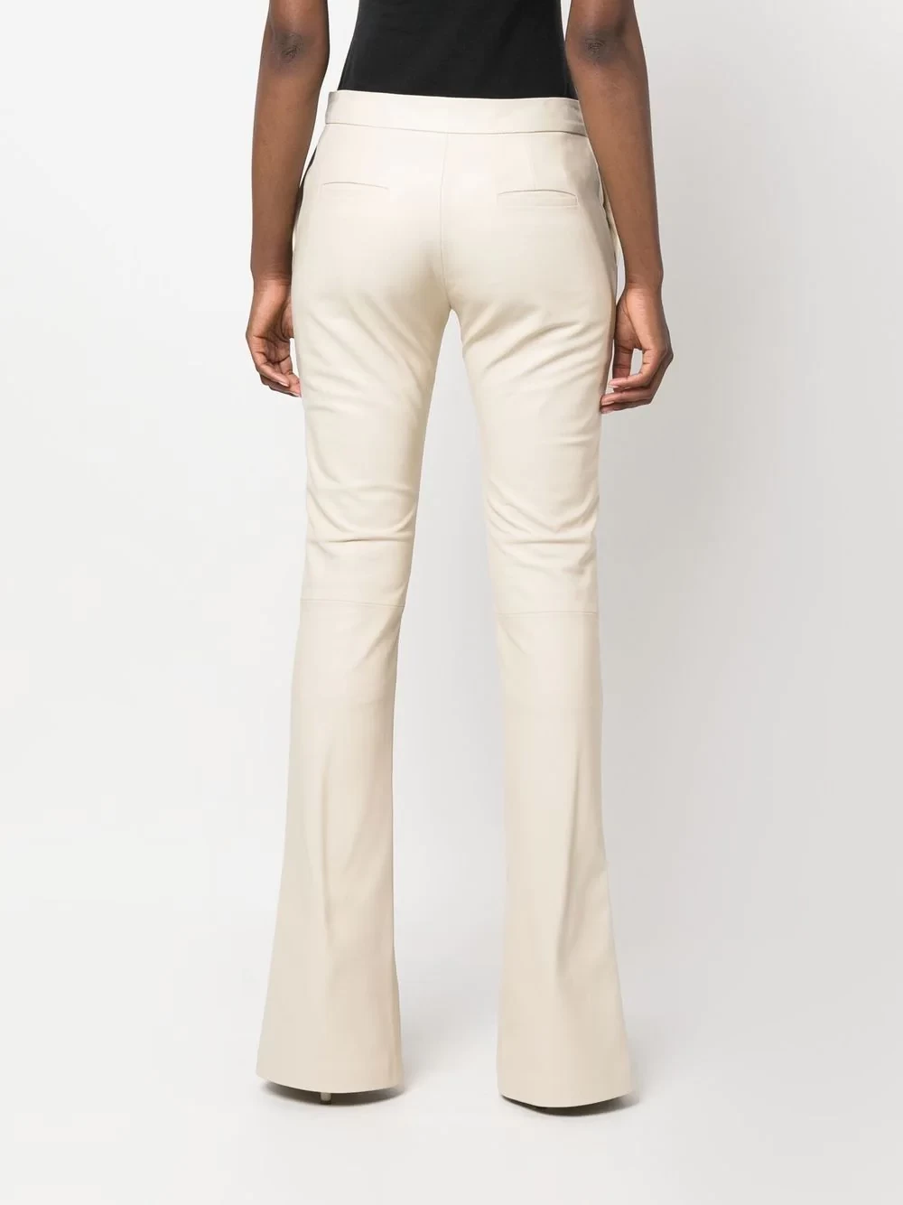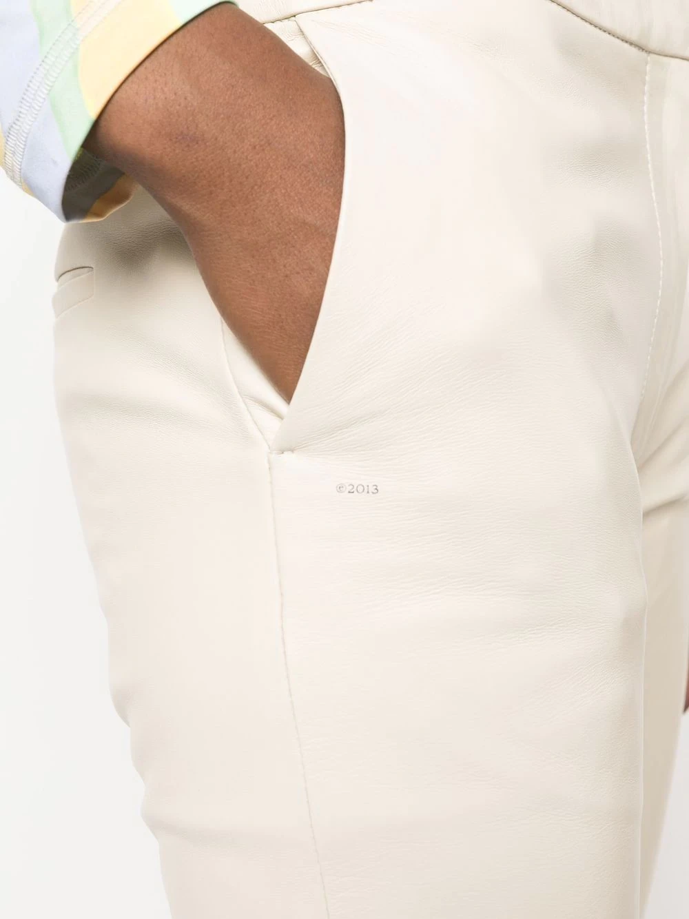 Corporate leather tailored trousers from OFF-WHITE featuring sand beige, leather, logo print at the leg, zip fly fastening, flared hem, slip pockets to the sides and two rear welt pockets.