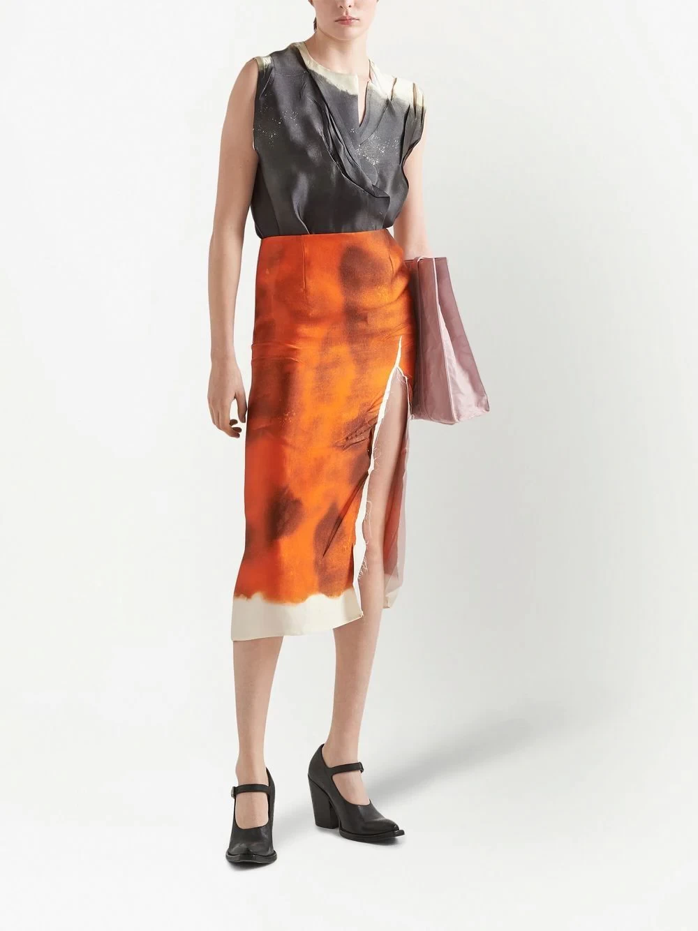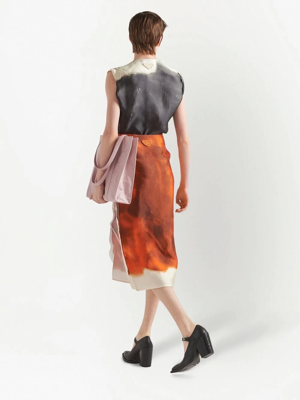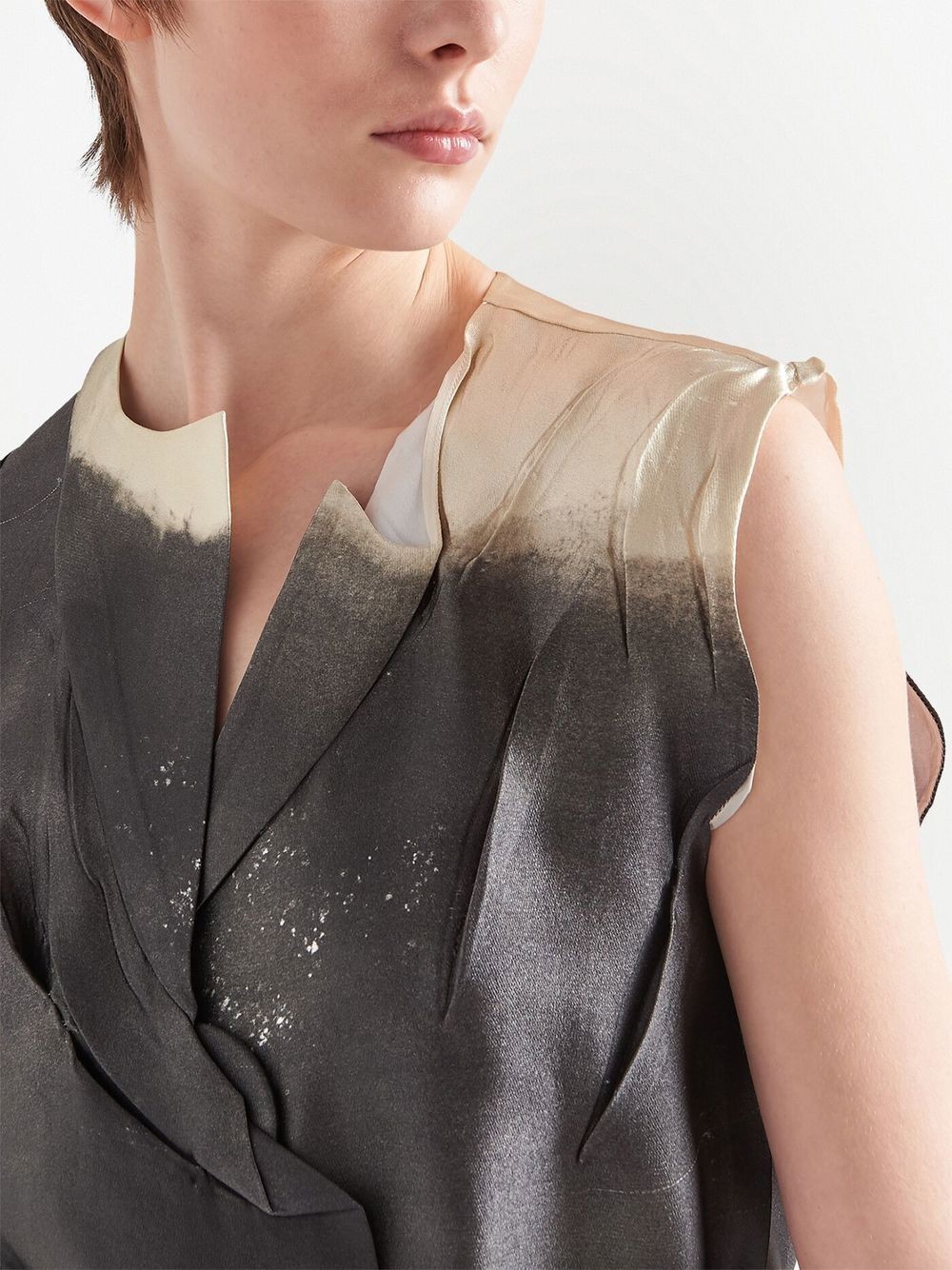 creased-detail sleeveless blouse from PRADA featuring satin finish, crease effect, decorative button detailing, V-neck, sleeveless, straight hem and lead grey.