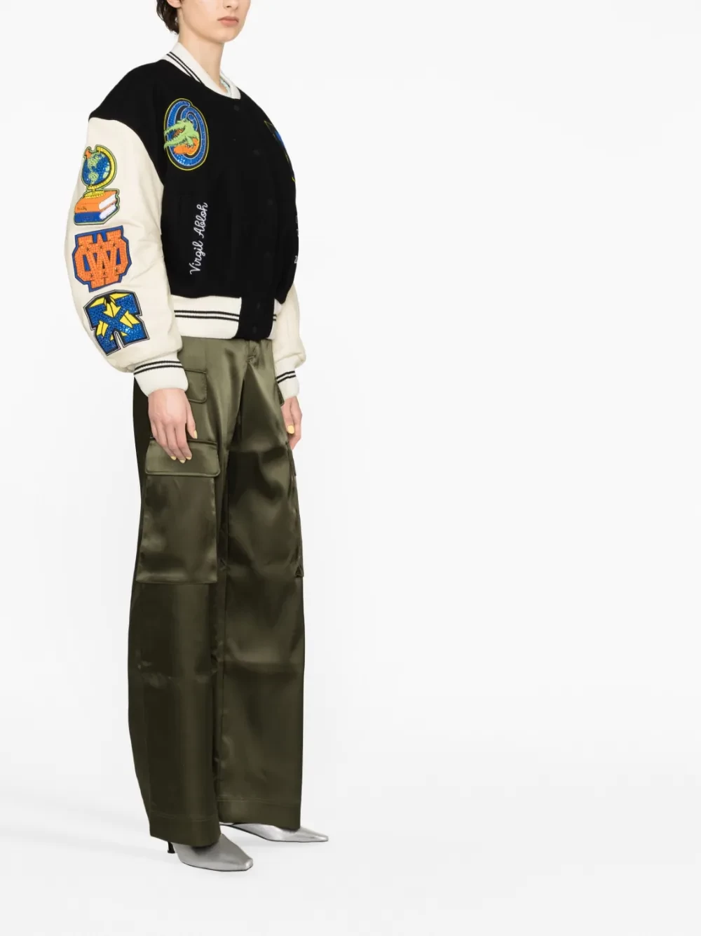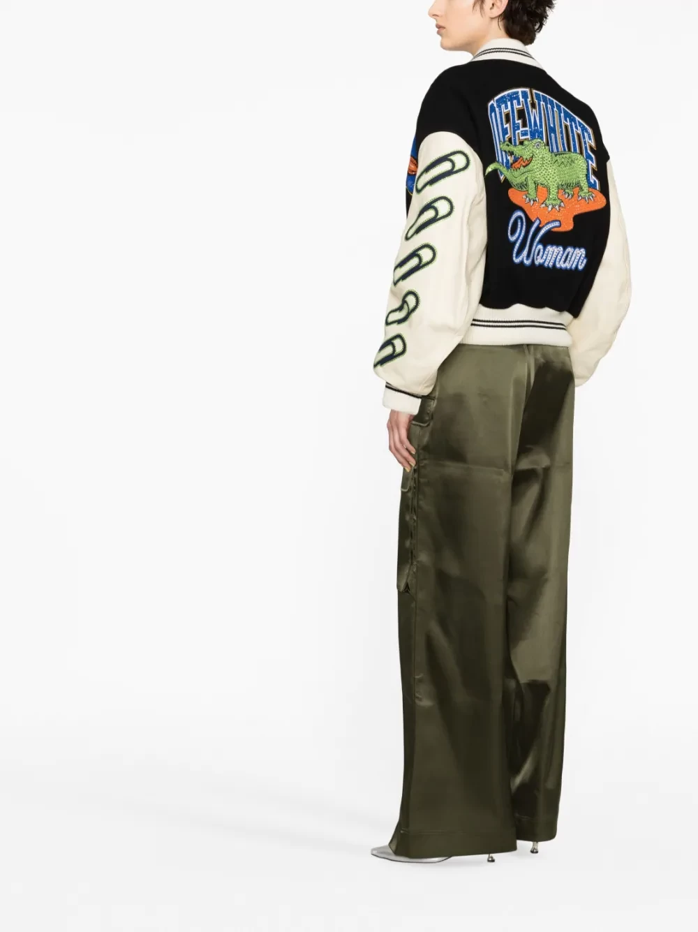 Croco Crop-patches bomber jacket from OFF-WHITE featuring black/white, virgin wool blend, logo patches to the front, logo patch to the rear, embroidered logo to the front, embroidered slogan, embroidered logo at the sleeve, ribbed band collar, stripe detailing, front button fastening and ribbed cuffs and hem.