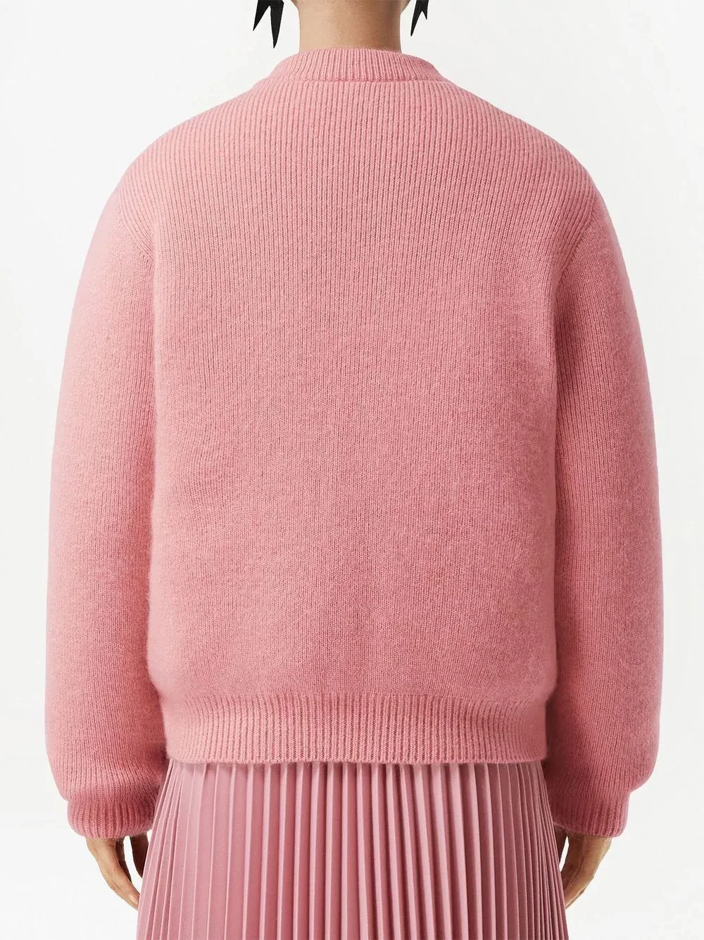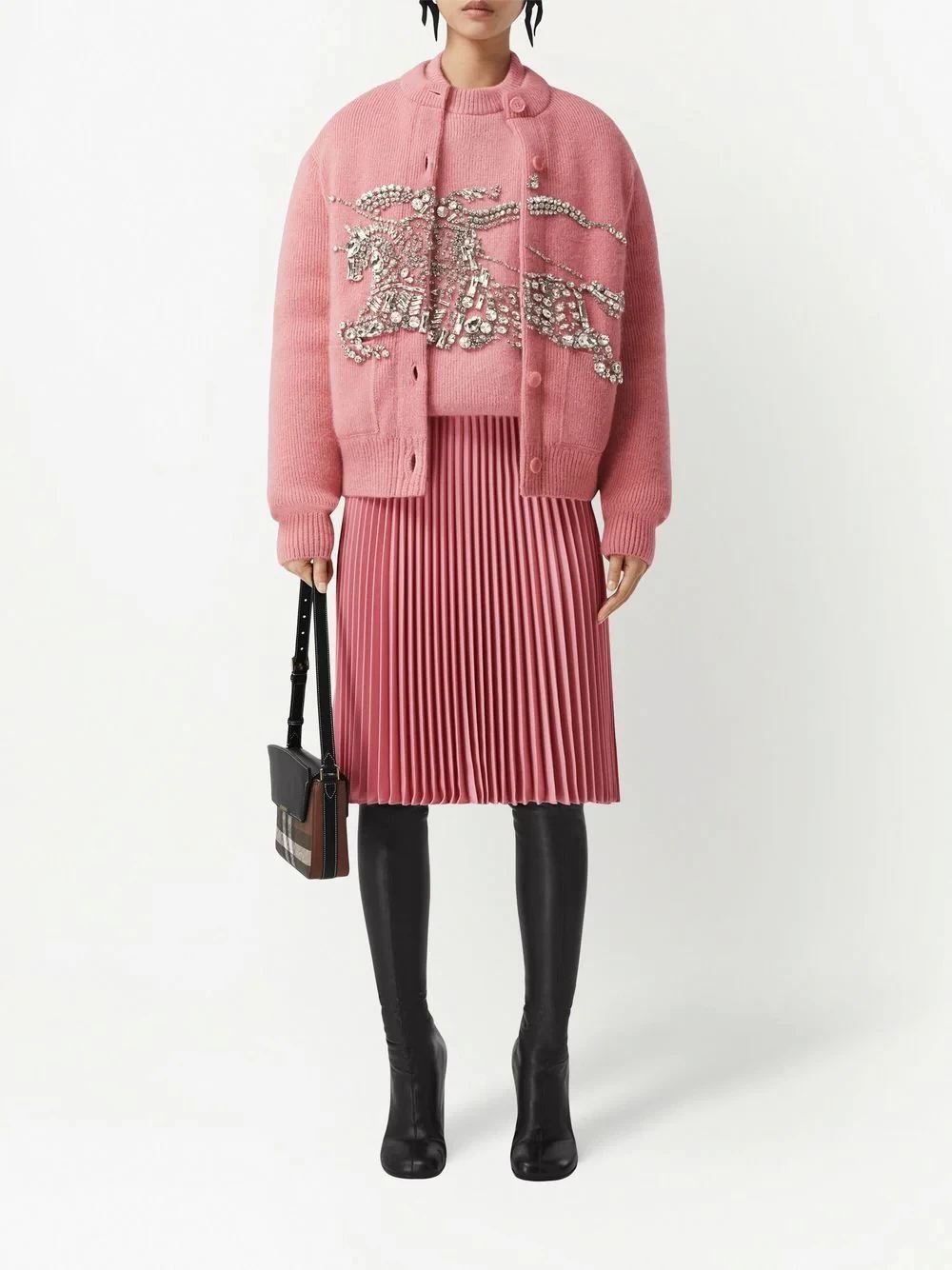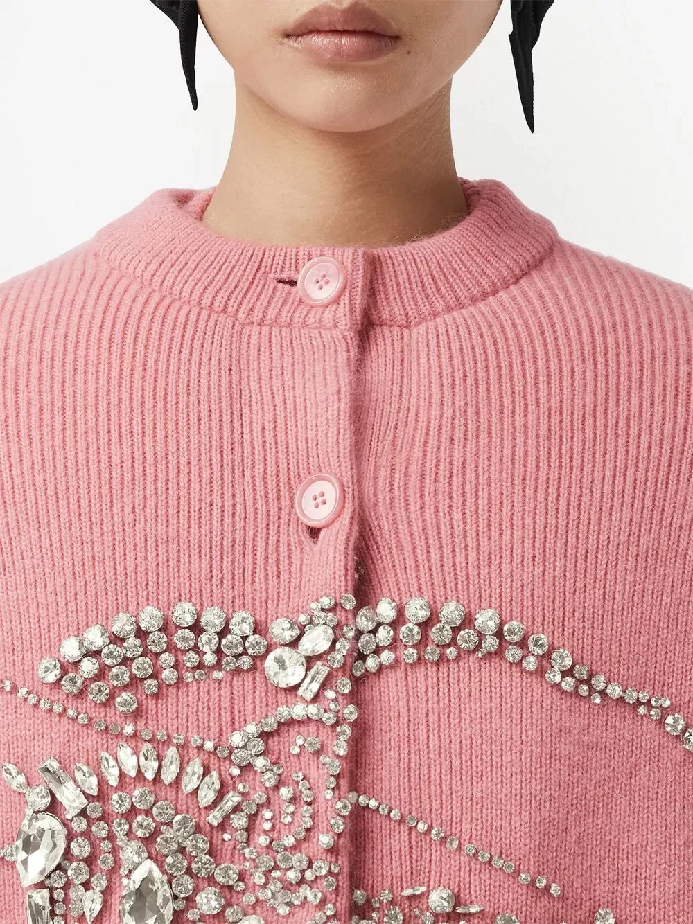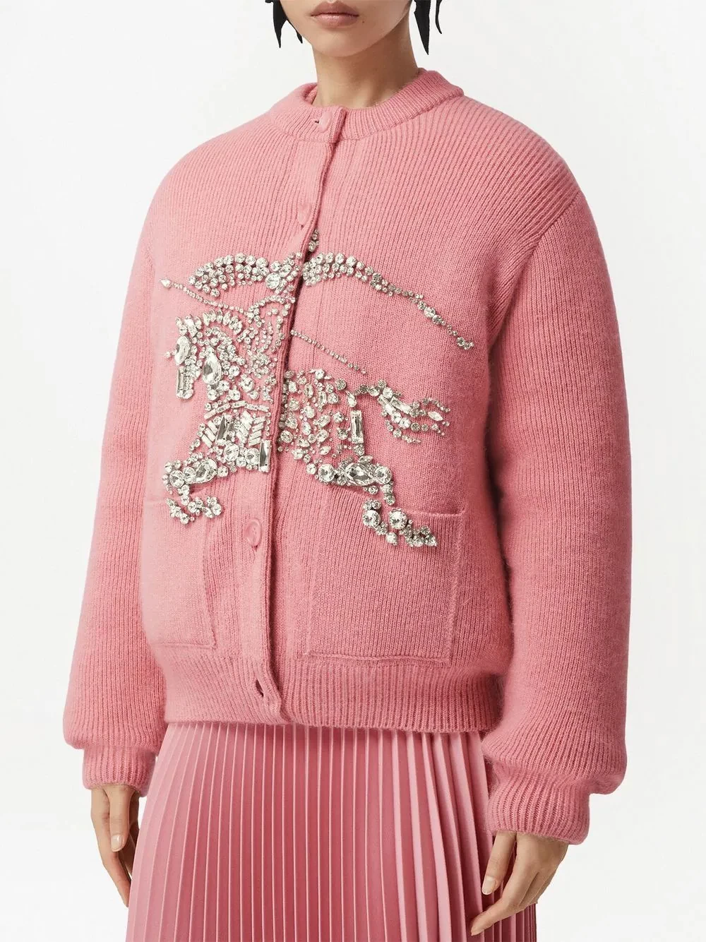crystal-embellished motif padded cardigan from BURBERRY featuring rose pink, wool blend, padded design, knitted construction, crystal embellishment, logo embellishment, round neck, front button fastening, long sleeves, straight hem, ribbed trim and two front patch pockets.