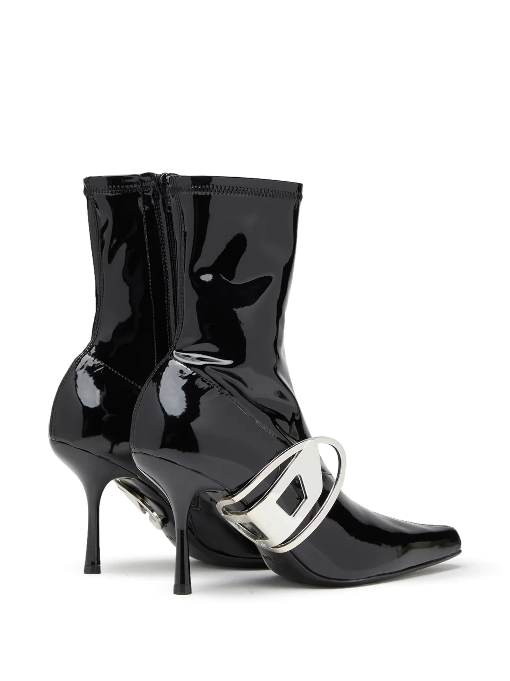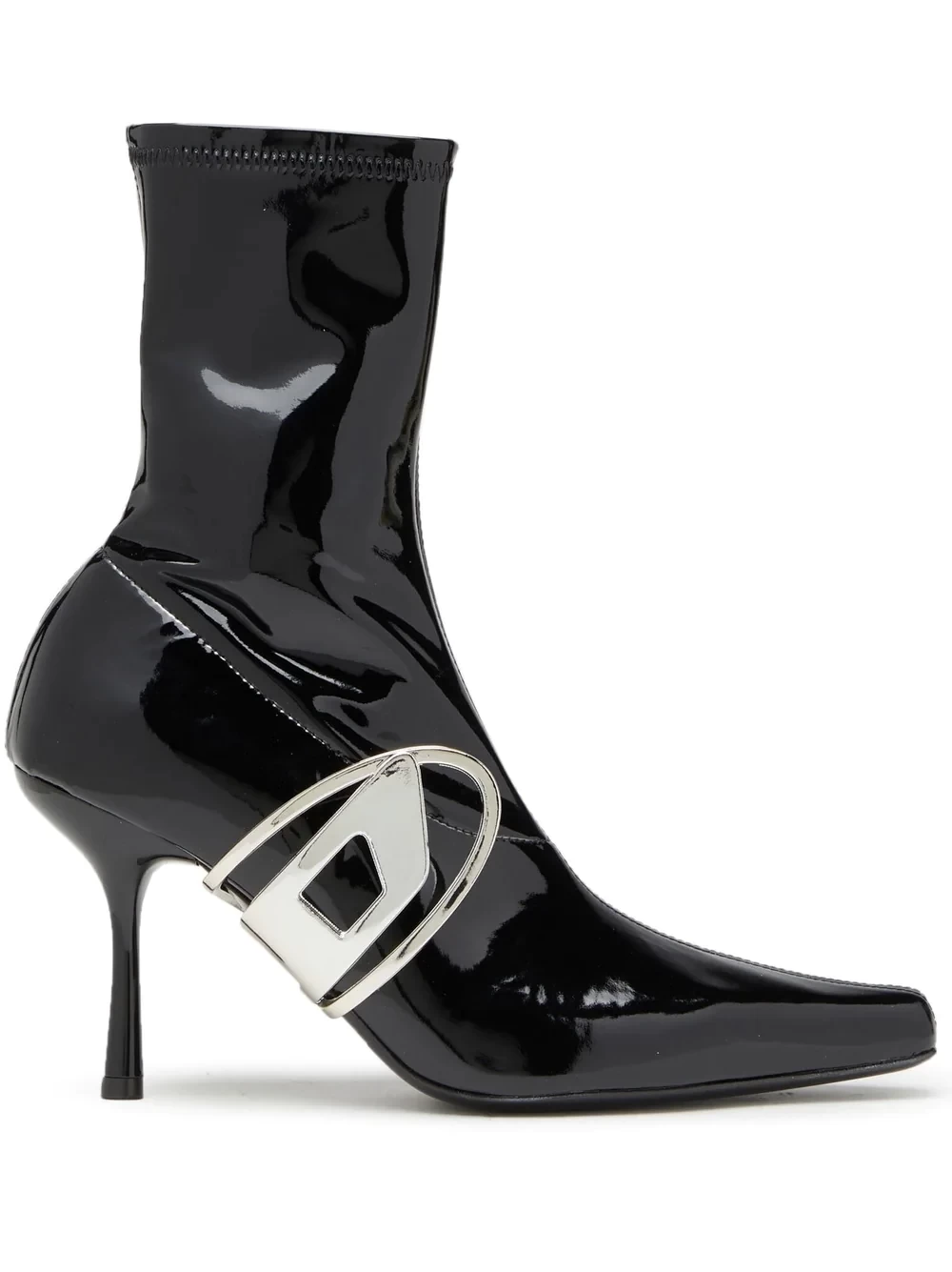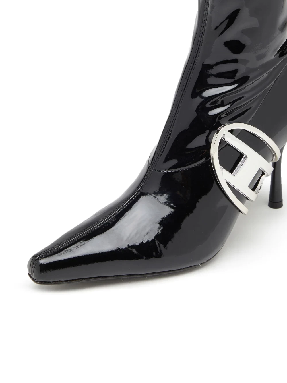 D-Eclipse logo-plaque boots from DIESEL featuring high-shine finish, silver-tone logo plaque, black, ankle length, pointed toe, branded insole and high heel.
