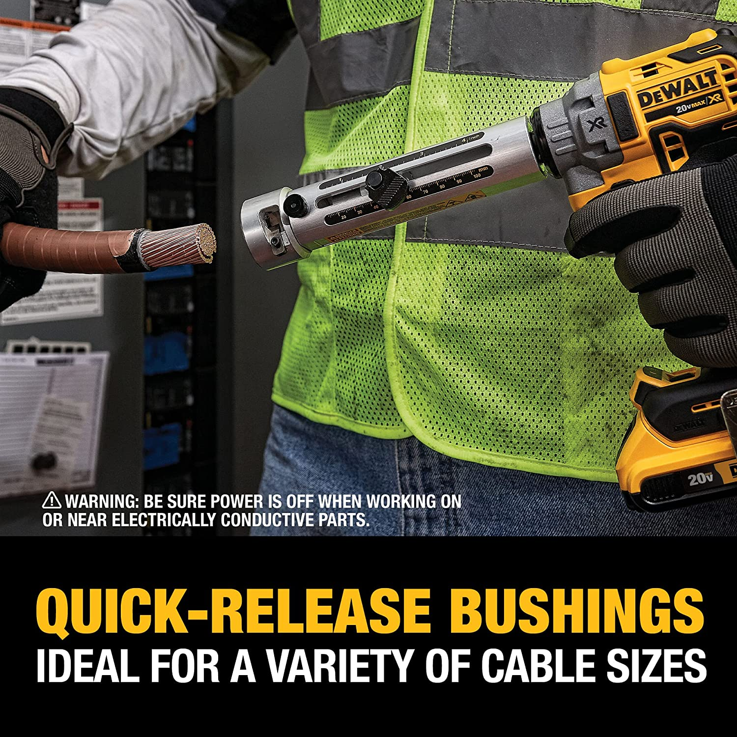 Using appropriate bushing, cable stripper works on both (THHN/XHHW) copper and aluminum cable, covering a range in size from 6 AWG to 750 MCM CU and 900 MCM AL