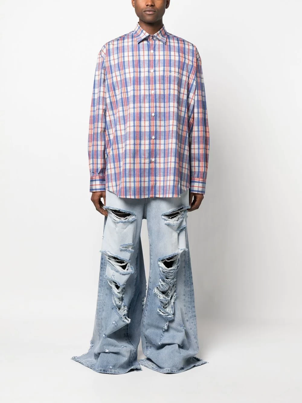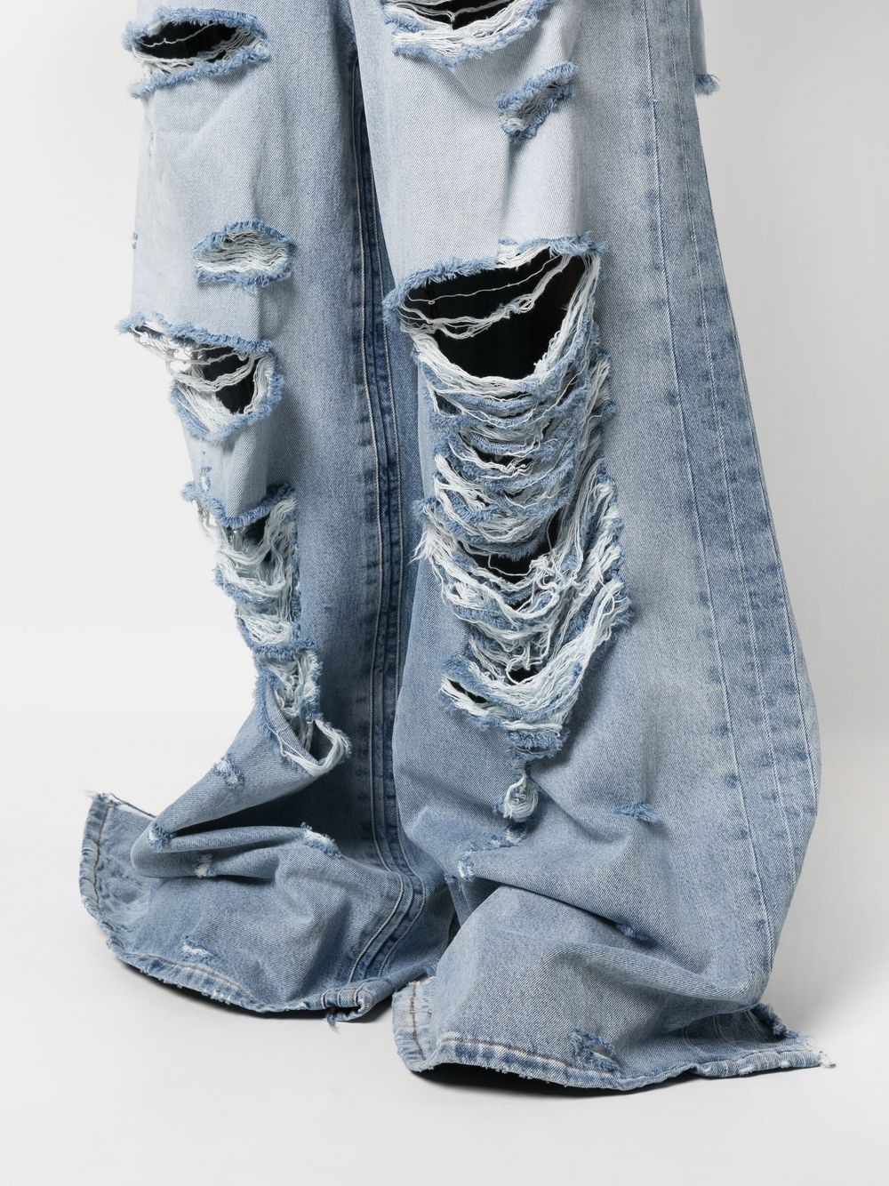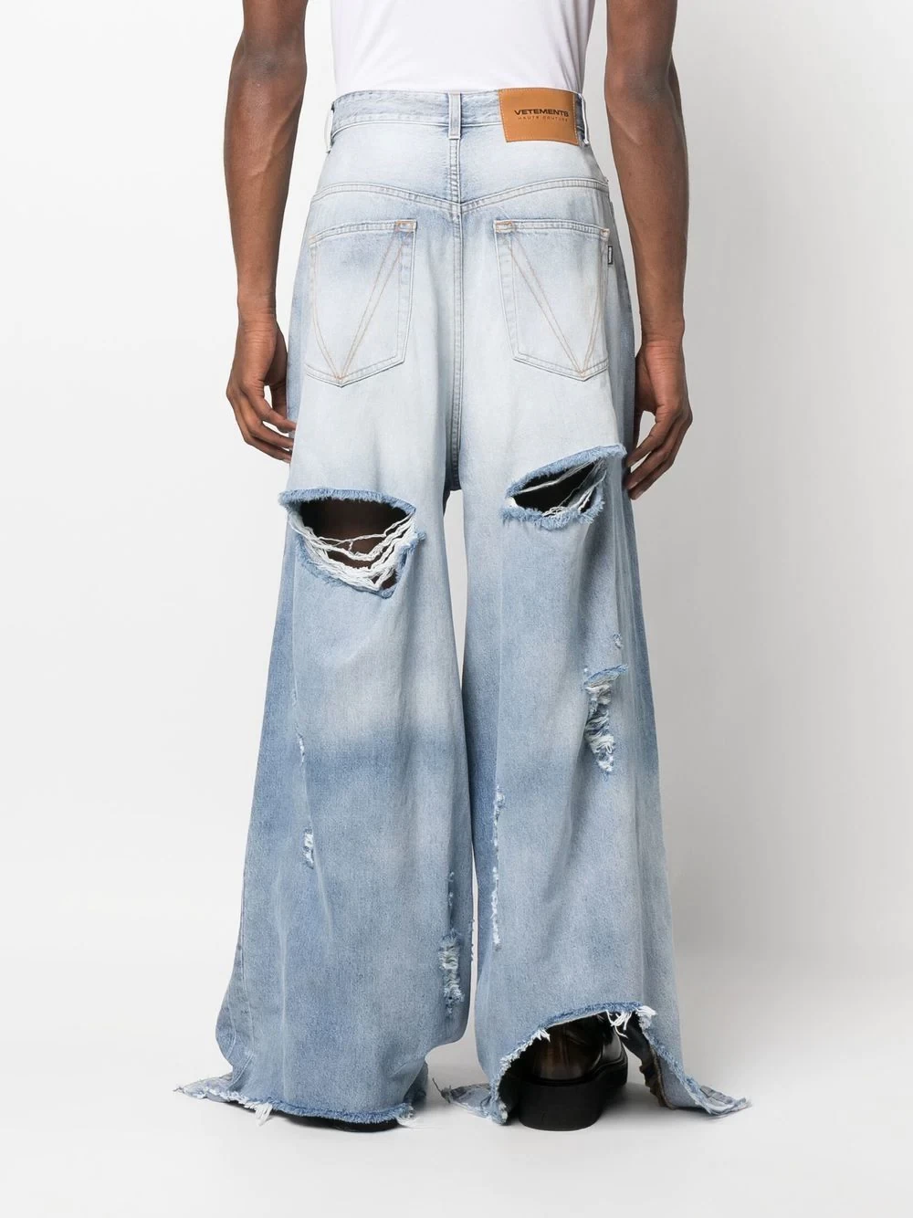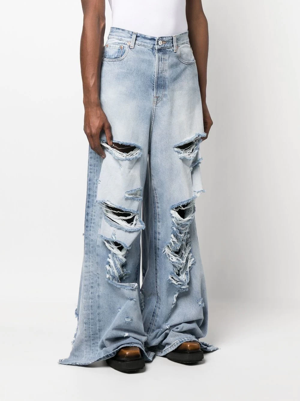 Vetements takes the wide-leg silhouette to another level with these light wash jeans, imagined in a statement distressed finish for SS23. The extra long length offers a finishing touch to the pair.