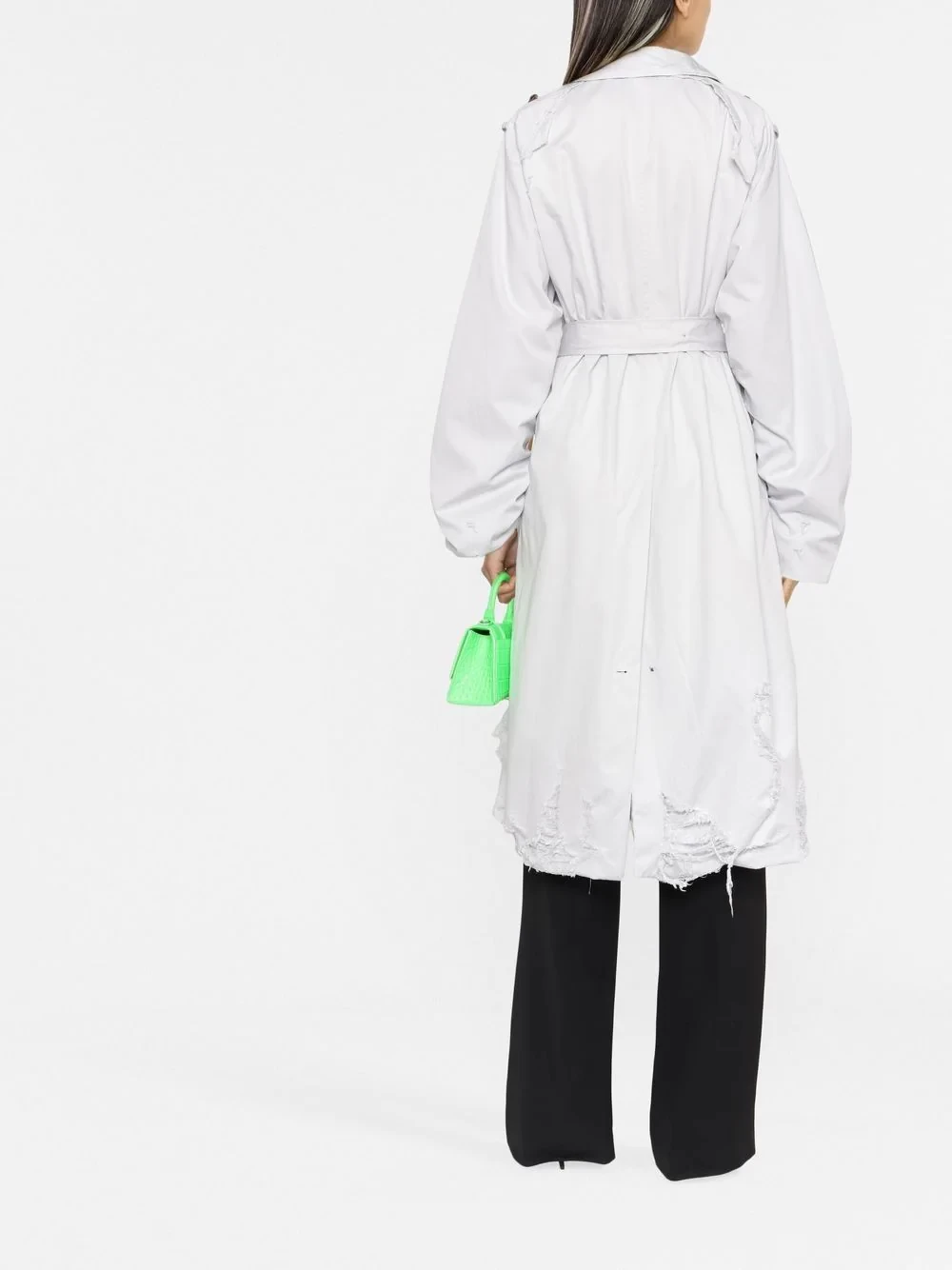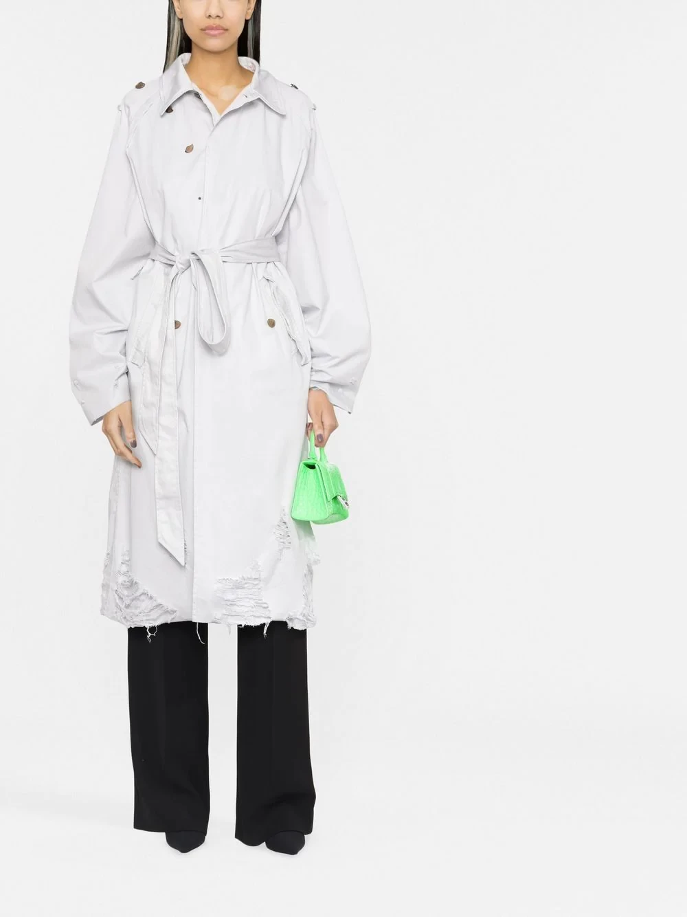 reinvents the car coat with its avant-garde sense of irreverence. The belted silhouette is adorned with distressed detailing, such as ripped fabric and broken buttons, creating a disruptive look.