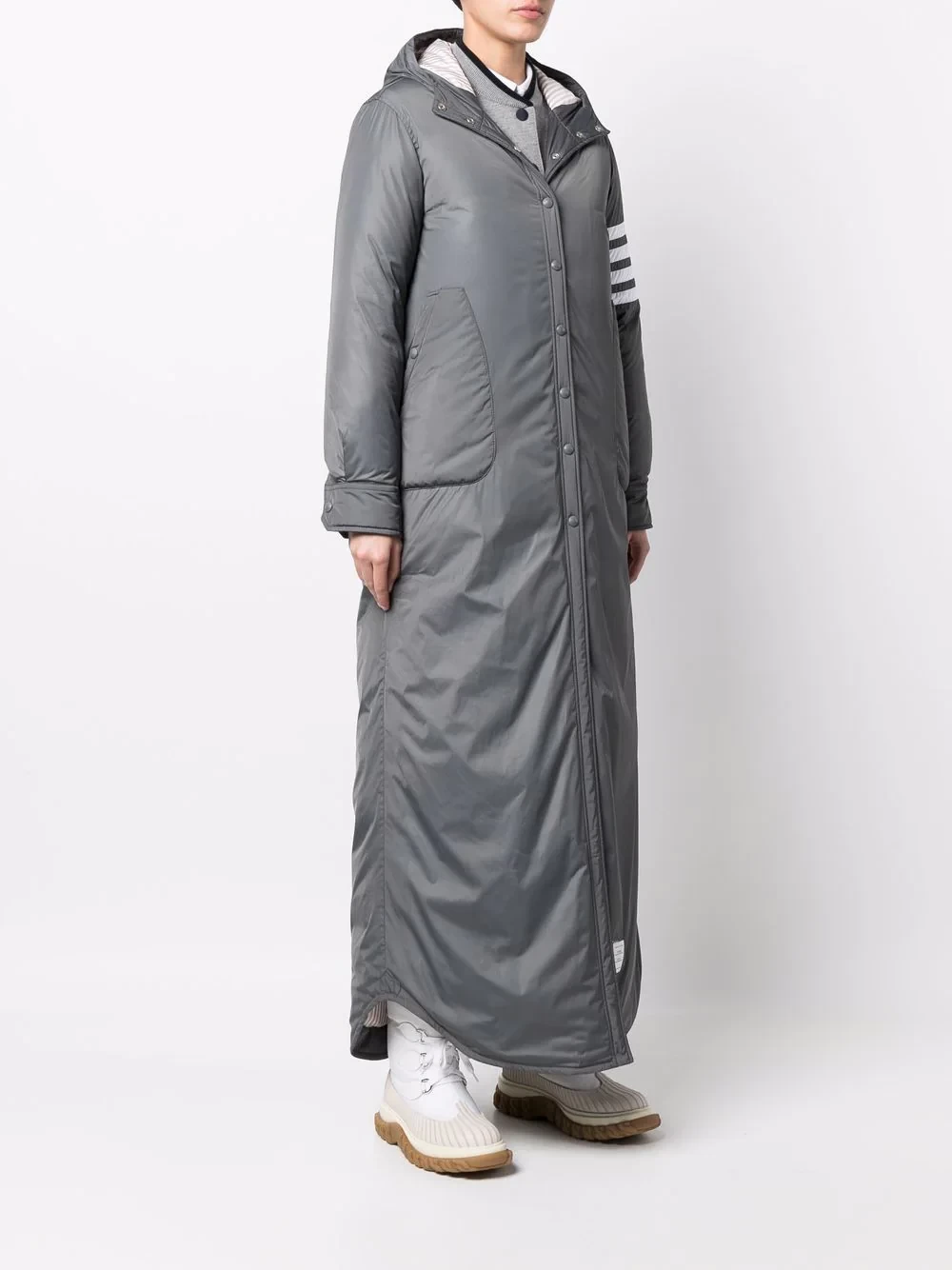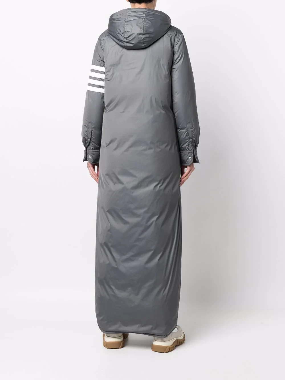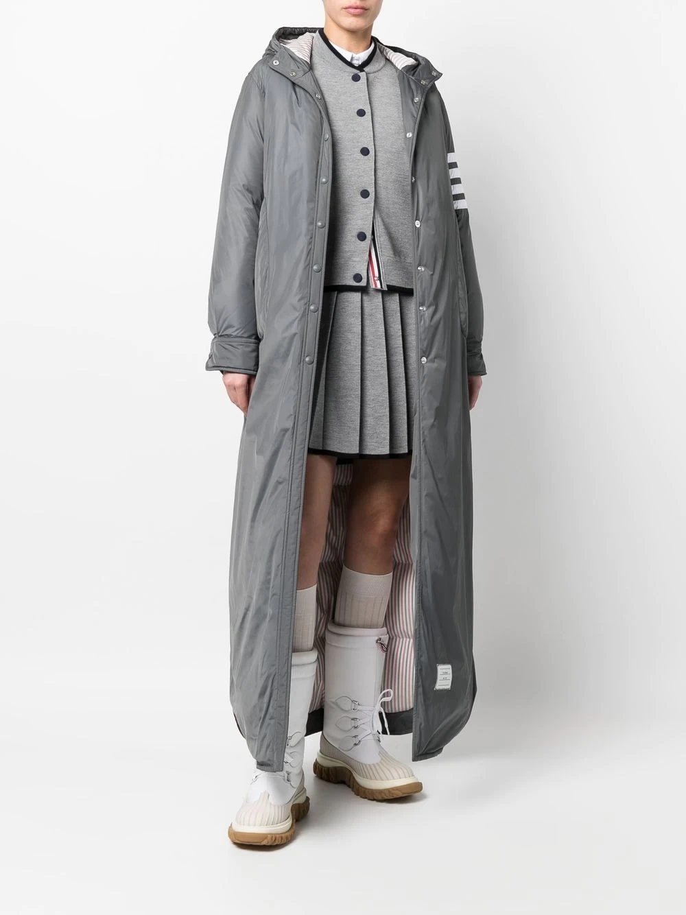 coat is crafted to a long length with a hooded design. A down-feather filling adds extra insulation to the medium-grey piece.