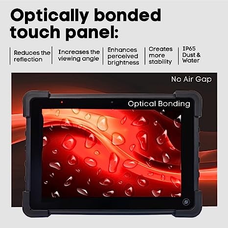 Usage: With its robust design and optically bonded high brightness display, this IP65 tablet is ideal in harsh environments and outdoor applications but can also be used in a semi-outdoor or indoor environment such as a factory floor, hospital, or office. Optically bonded display has increased stability, reduced reflection, increased viewing angle, and enhanced perceived brightness.