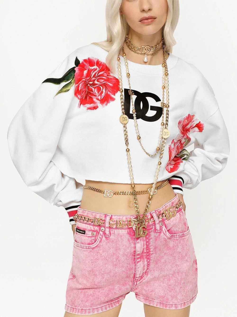 floral-print long-sleeved jumper from DOLCE & GABBANA featuring all-over floral print, logo print to the front, stripe detailing, round neck, long sleeves, straight hem, white/multicolour and cotton.