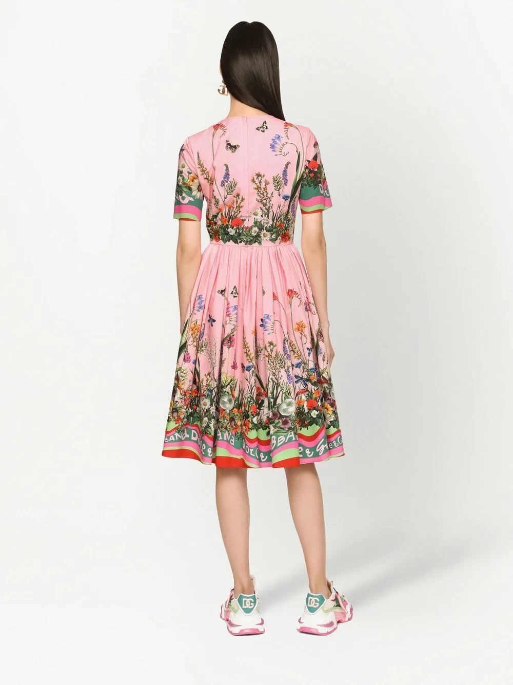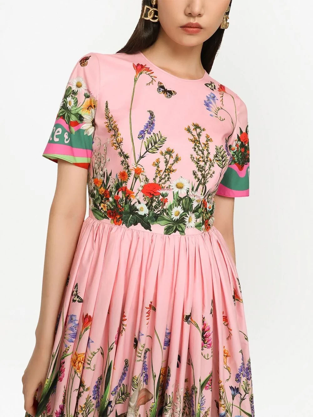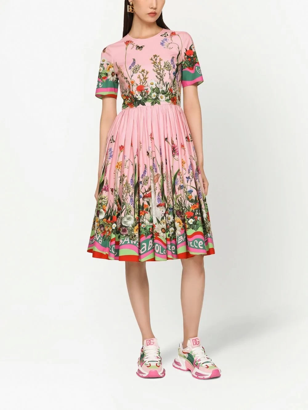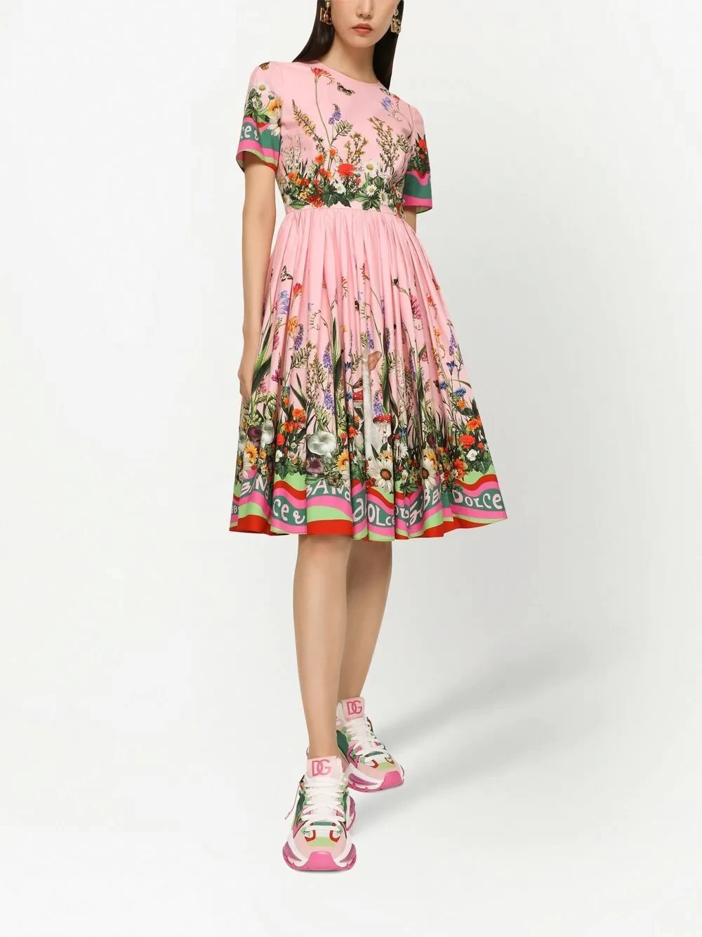 featuring rose pink, cotton, all-over floral print, logo print at the hem, round neck, rear zip fastening, short sleeves, flared skirt, straight hem and mid-length.