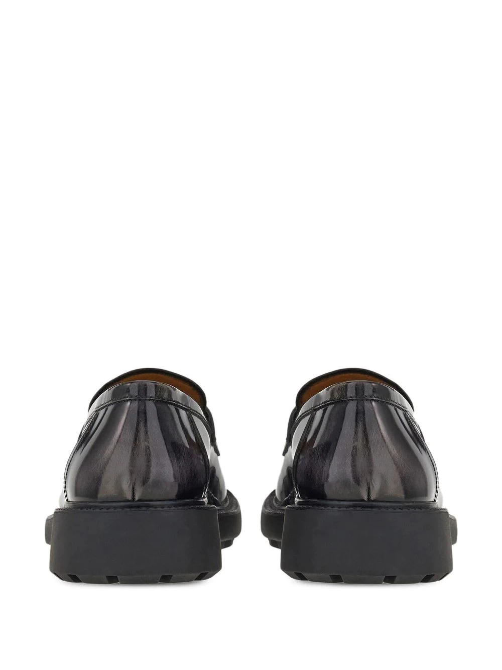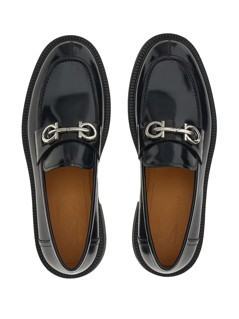 Salvatore Ferragamo gathered inspiration at the entrance of the Florentine building - the Italian brand's headquarters - to create the Gancini motif. Featured across its collections, the emblematic motif takes focus in these patent leather loafers in a contrasting silver tone.