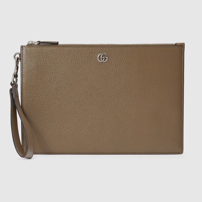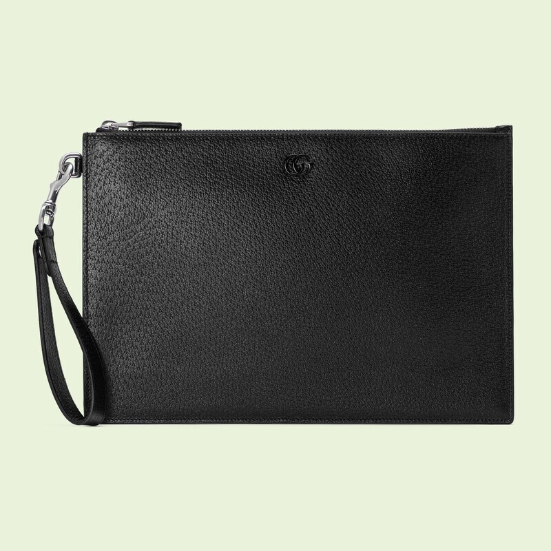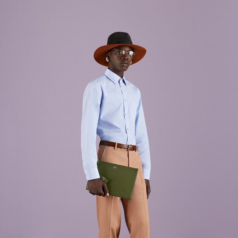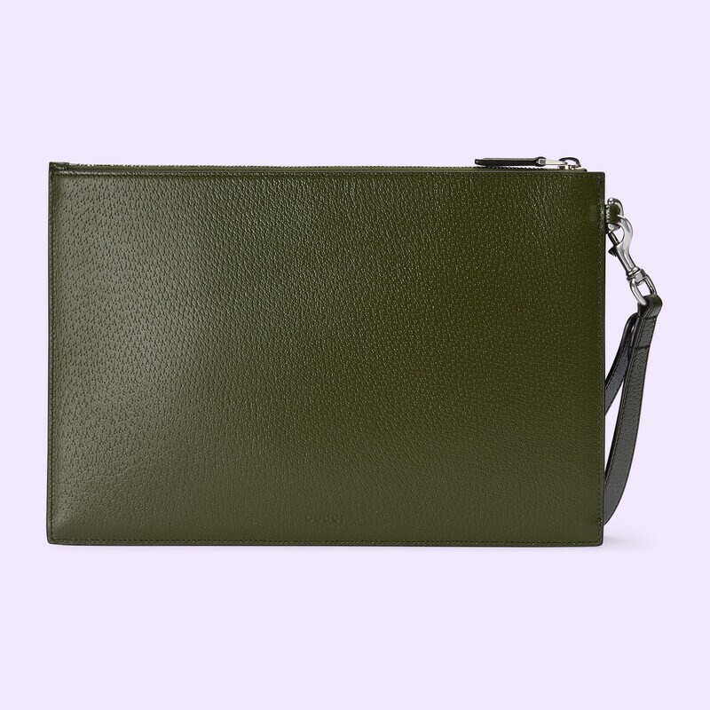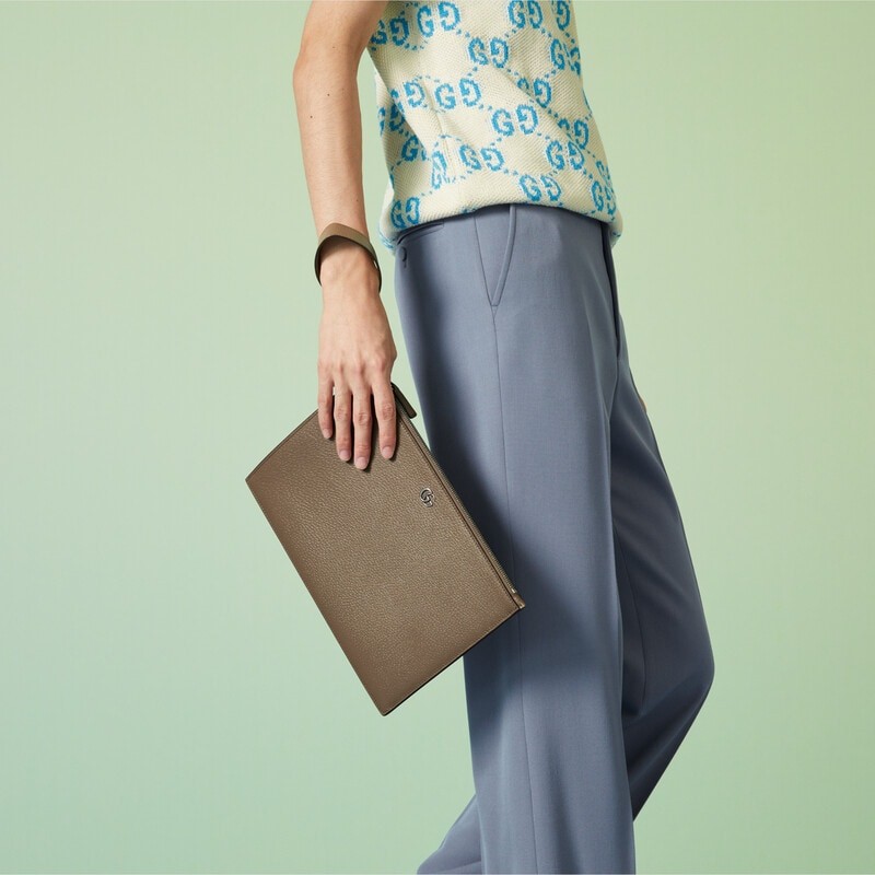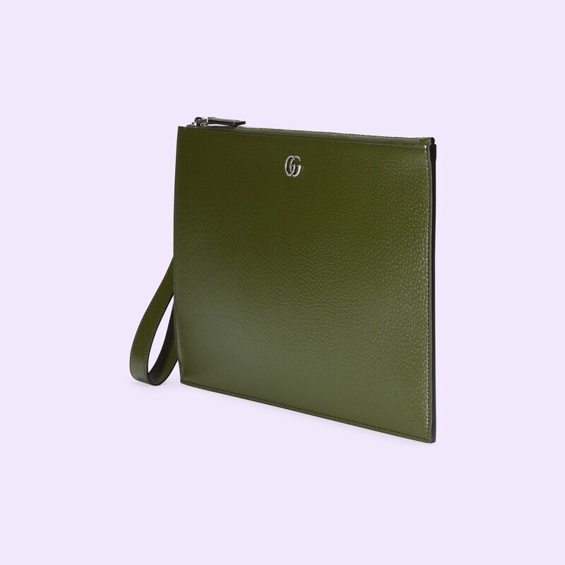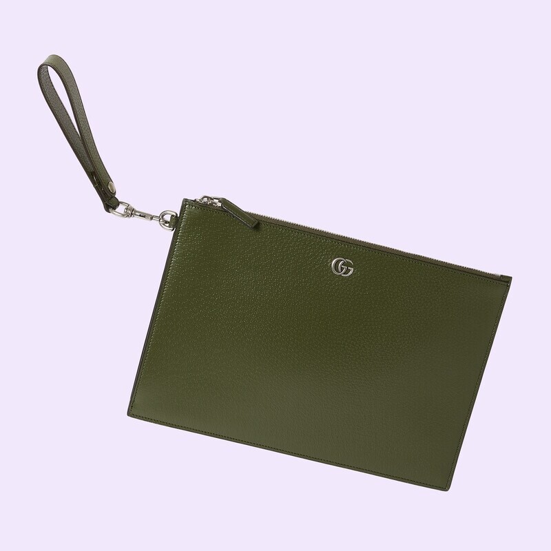 • Gucci continues to update its color palette and add more refined shades. In the new colour palette and combinations, the brand reinterprets the classic GG Marmont collection with a modern perspective. This clutch is crafted from forest-green leather and finished with branded accessories in palladium gold.