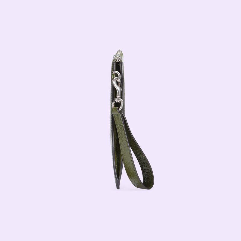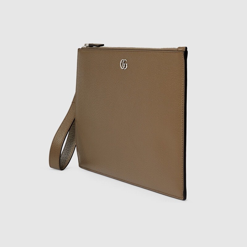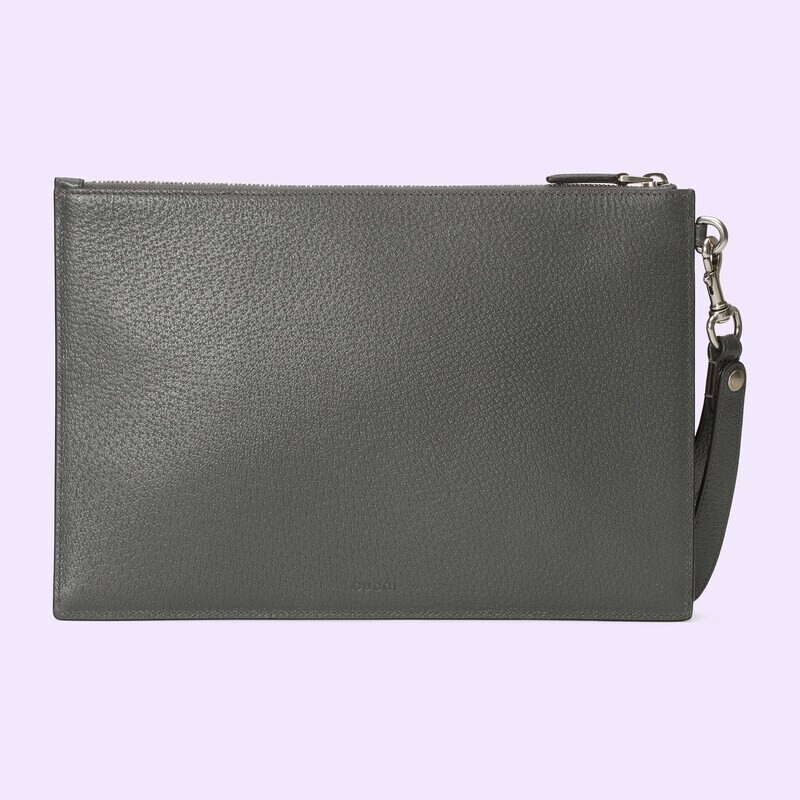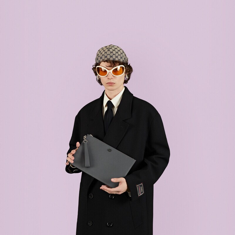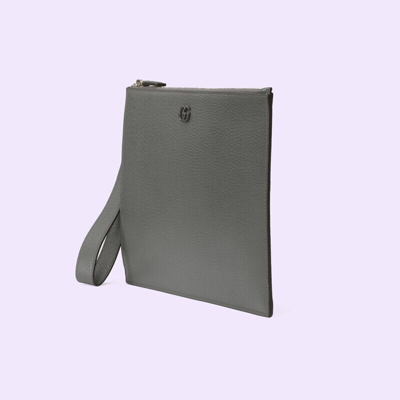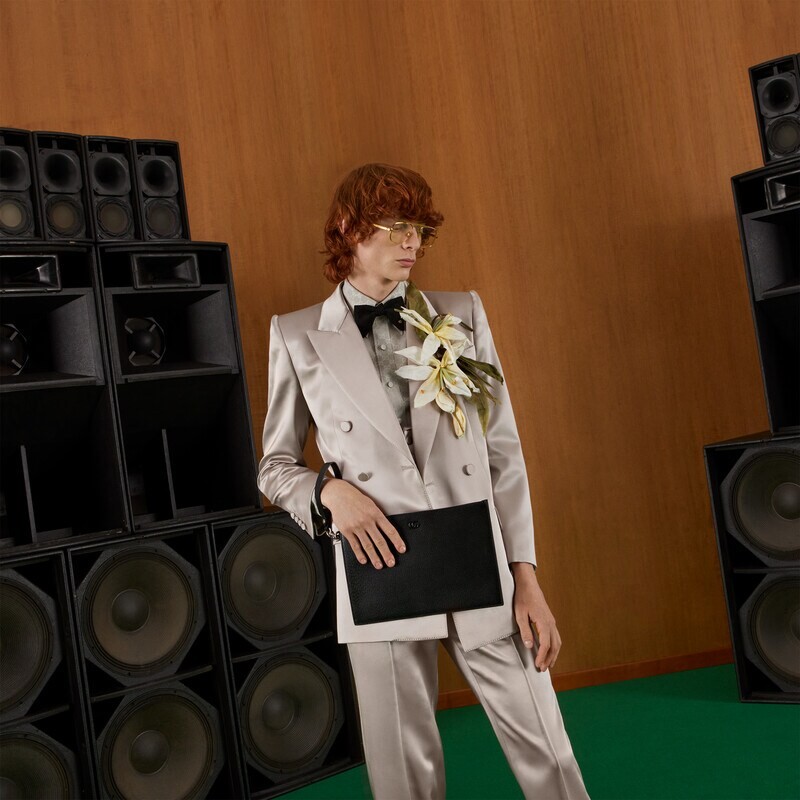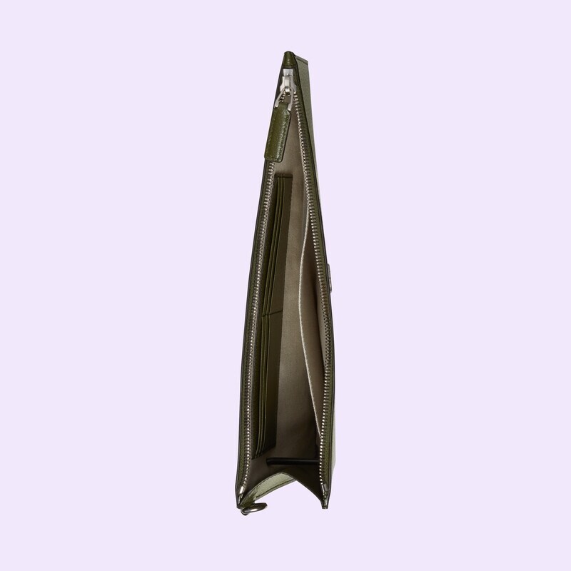 • Gucci continues to update its color palette and add more refined shades. In the new colour palette and combinations, the brand reinterprets the classic GG Marmont collection with a modern perspective. This clutch is crafted from forest-green leather and finished with branded accessories in palladium gold.