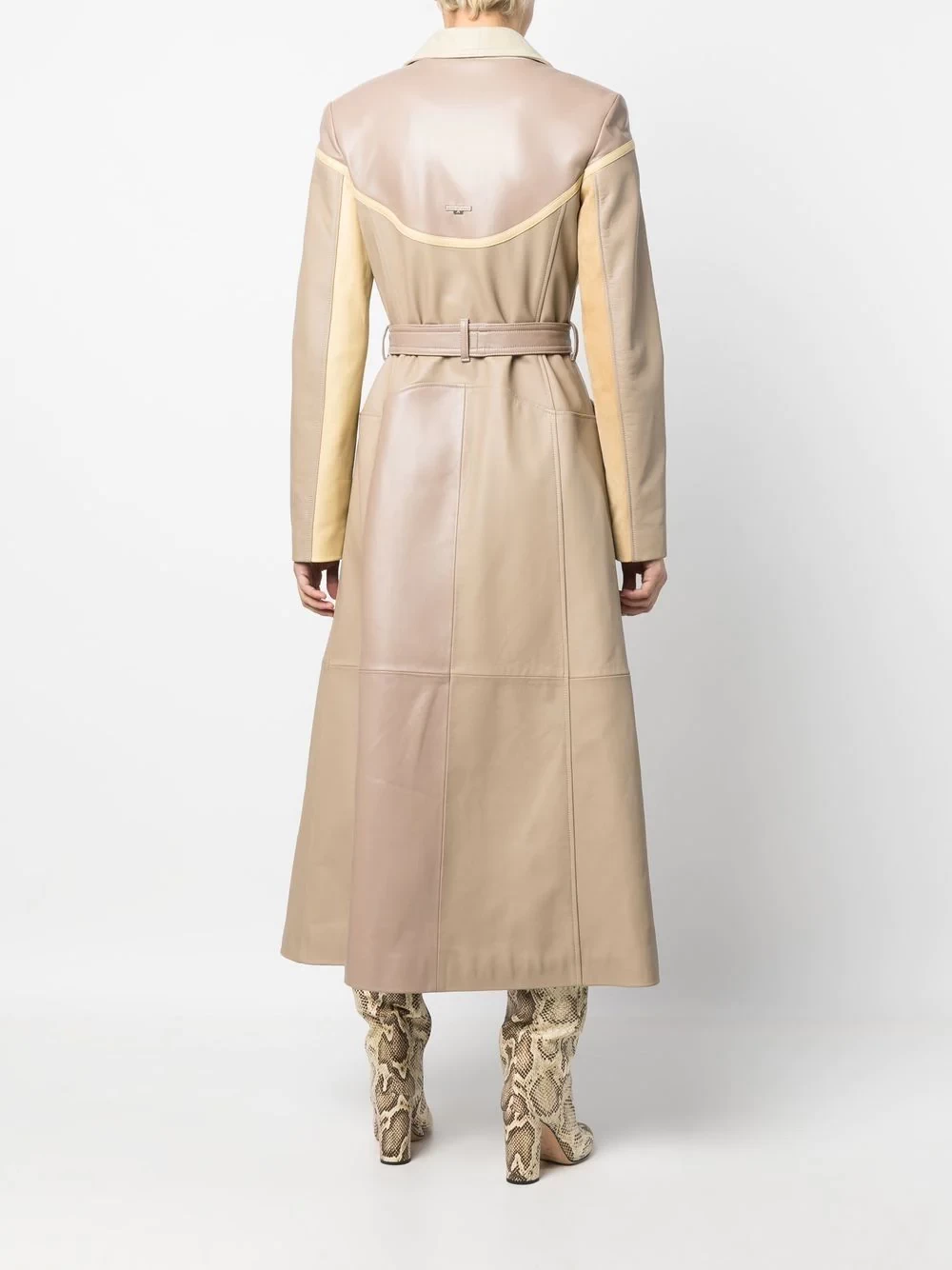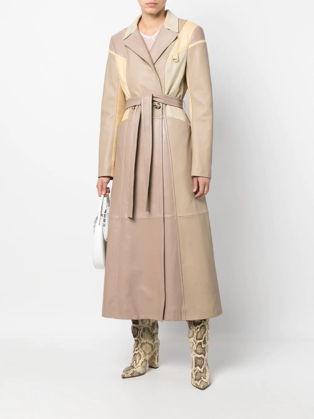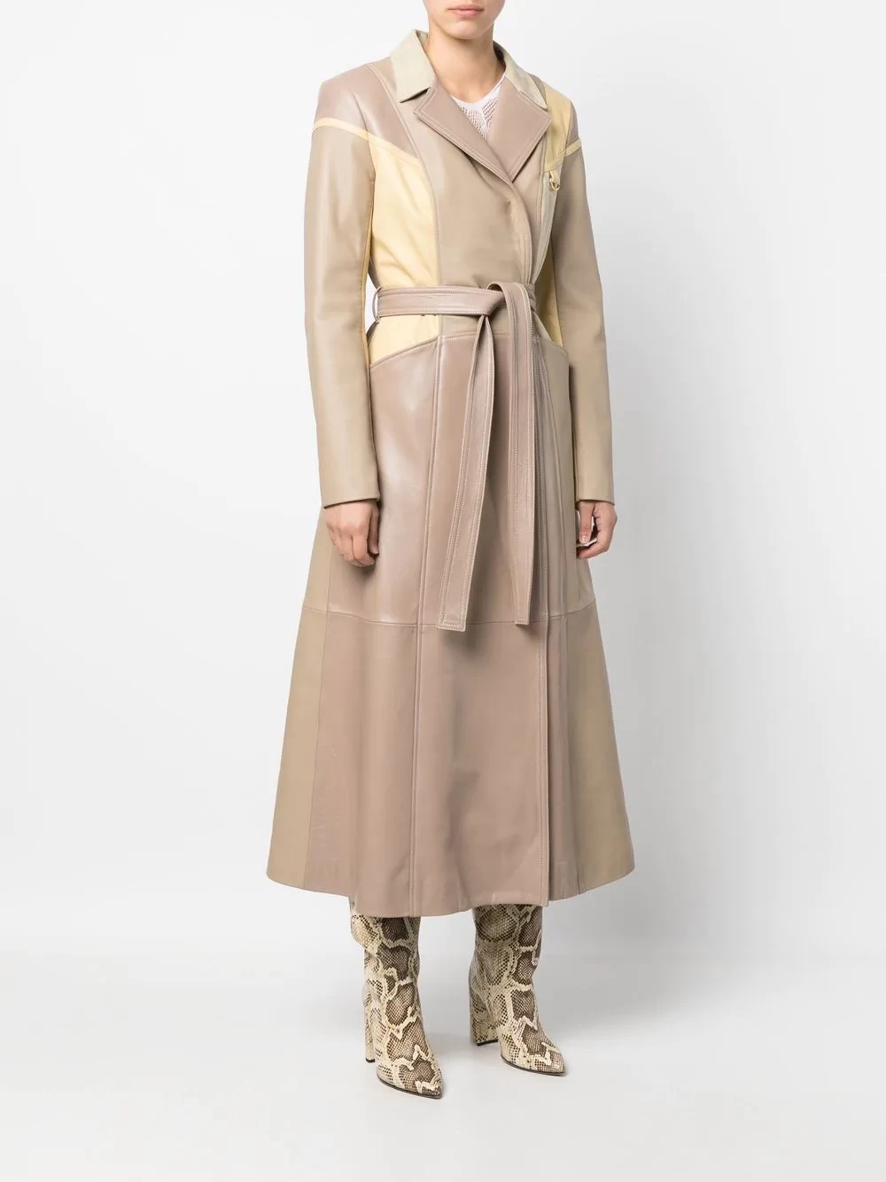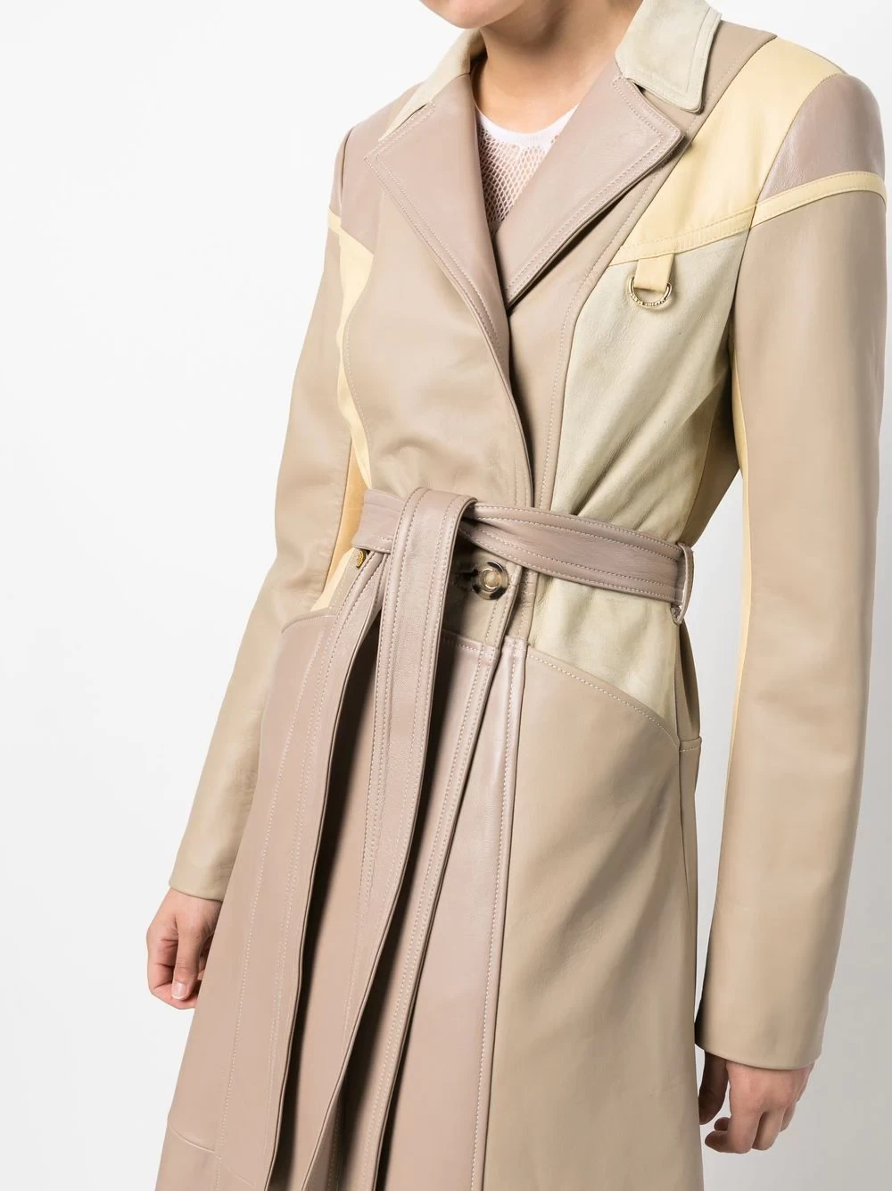designs this tonal beige coat for a patchwork effect that elevates its smooth sheepskin construction. Belted at the waist for a defined silhouette, this piece is complete with metallic hardware for an industrial-inspired look.