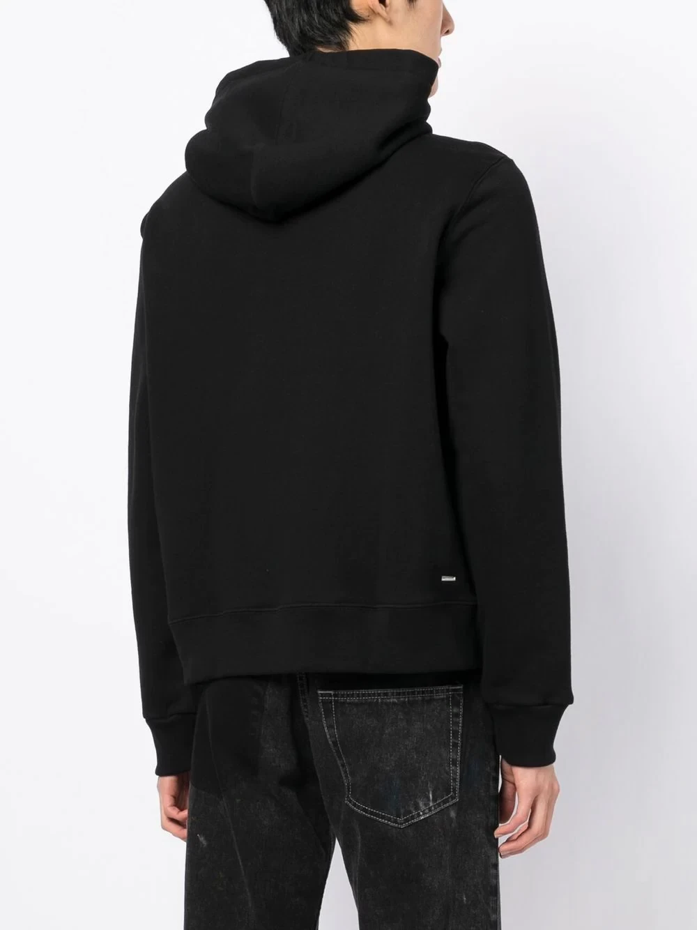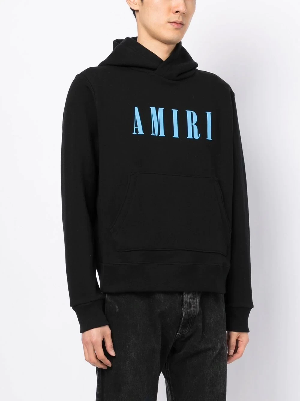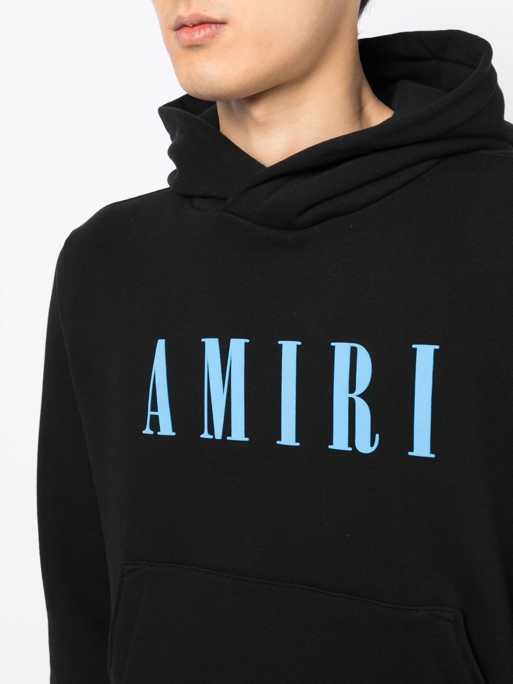 logo-print cotton hoodie from AMIRI featuring black, aqua blue, cotton, logo print to the front, slouchy hood, long sleeves, front pouch pocket and straight hem.