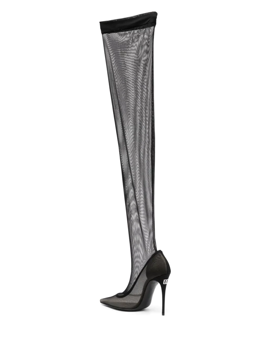 Renowned for their glamorous aesthetic and Italian refinement, Dolce & Gabbana presents these sheer tulle boots in a classic black colourway. Boasting a thigh-high design, this pair rests on a towering 105mm stiletto heel for a striking finish.