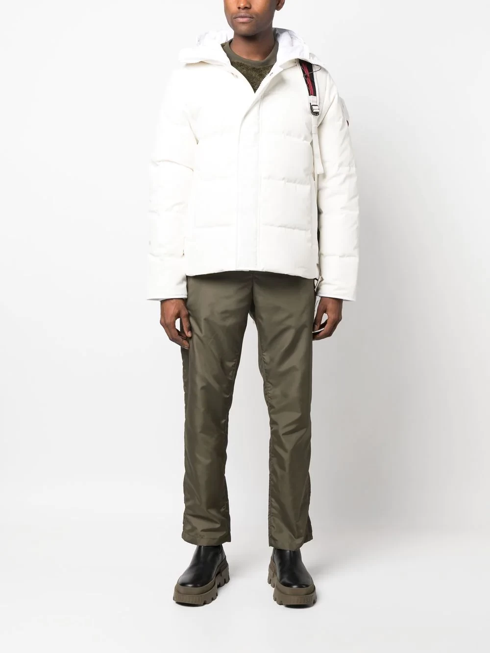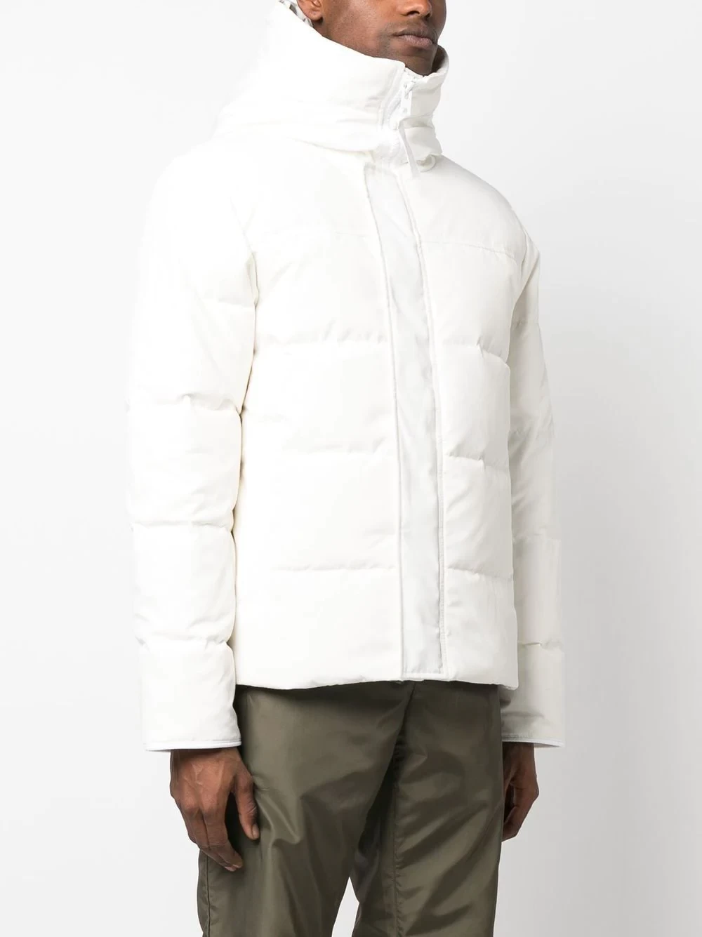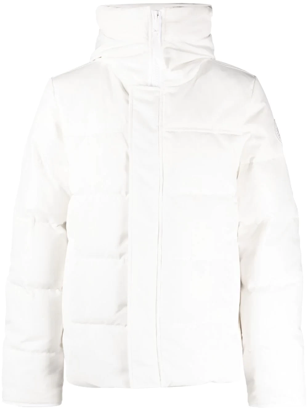 MacMillan padded down coat from CANADA GOOSE featuring white, feather down, cotton blend, windproof, padded design, high neck, concealed front fastening, long sleeves, elasticated cuffs, two side slit pockets, straight hem and down-filled snorkel hood.