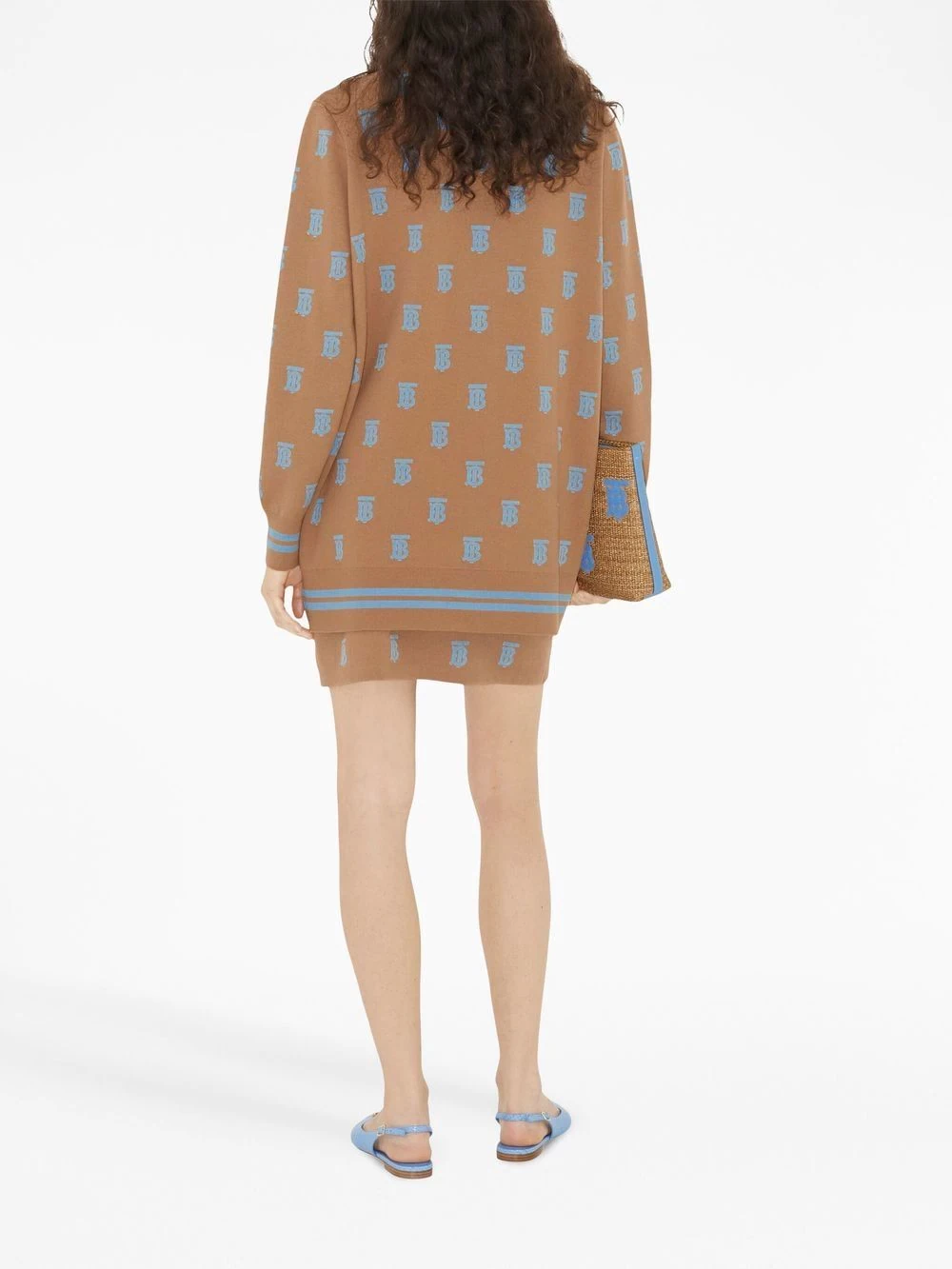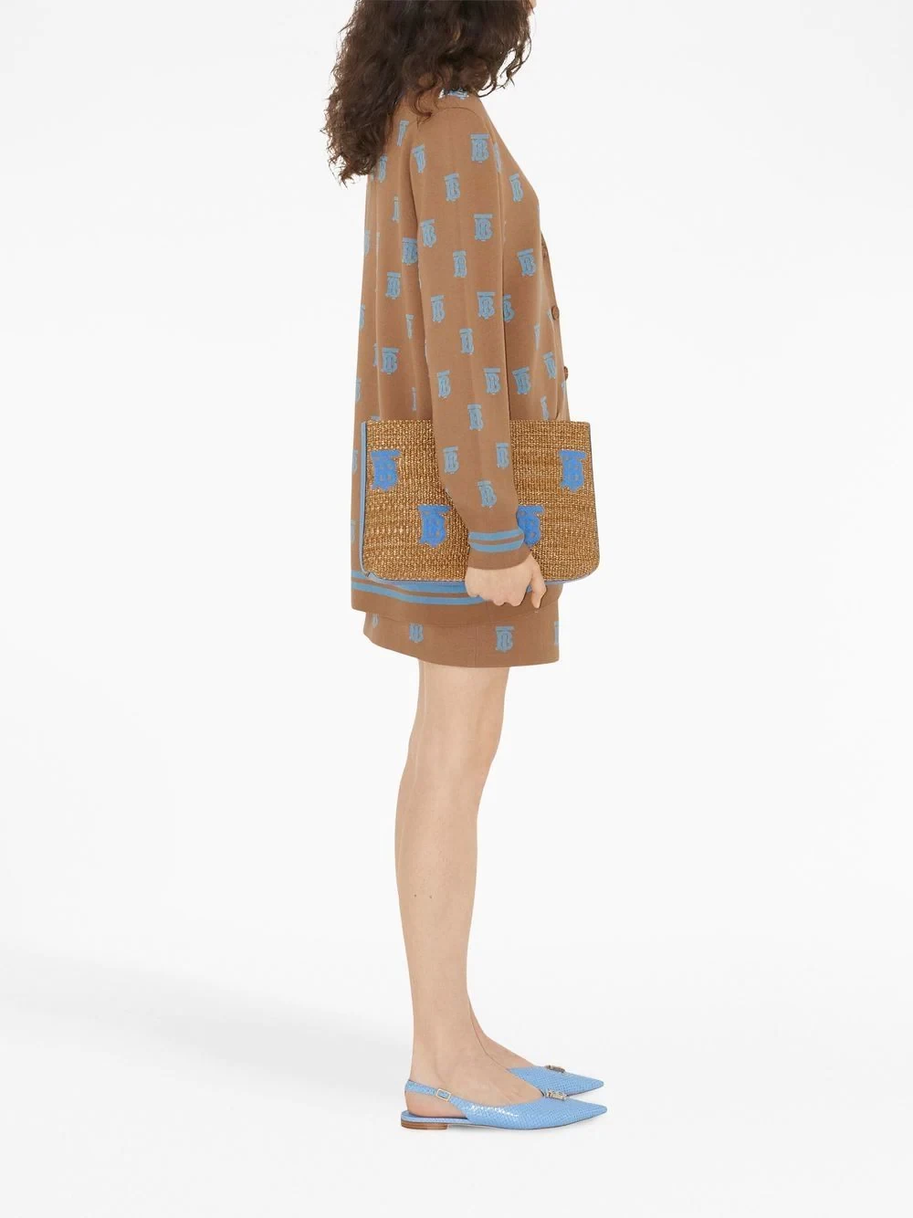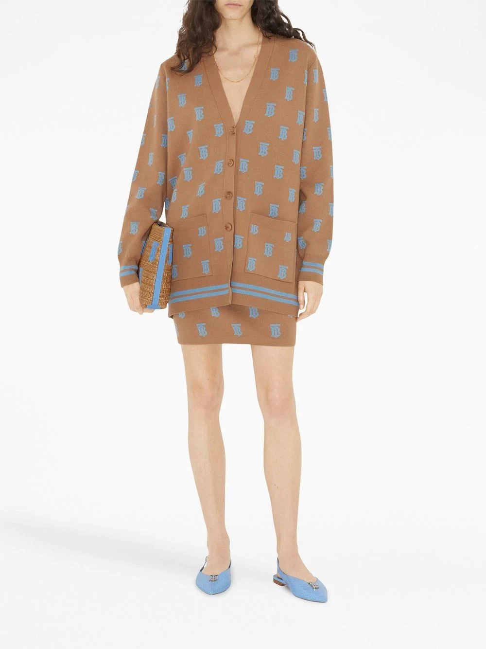 monogram oversized cardigan from BURBERRY featuring camel brown, light blue, wool-silk blend, monogram pattern, V-neck, front button fastening, long sleeves, ribbed cuffs and hem and two front patch pockets.