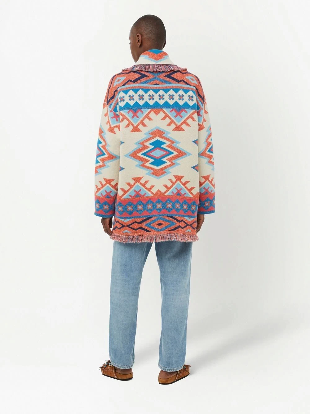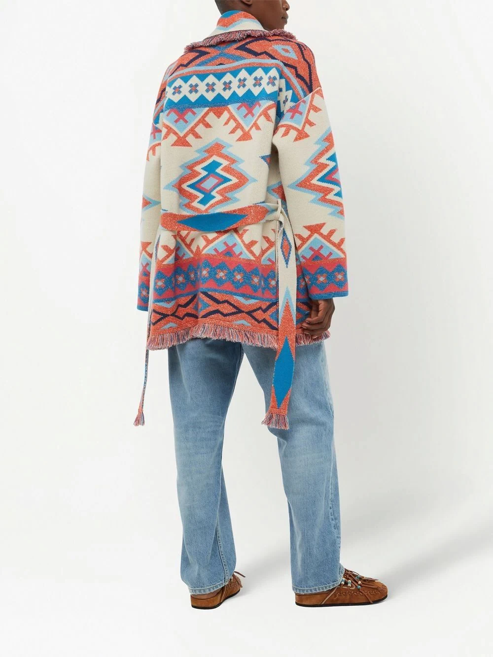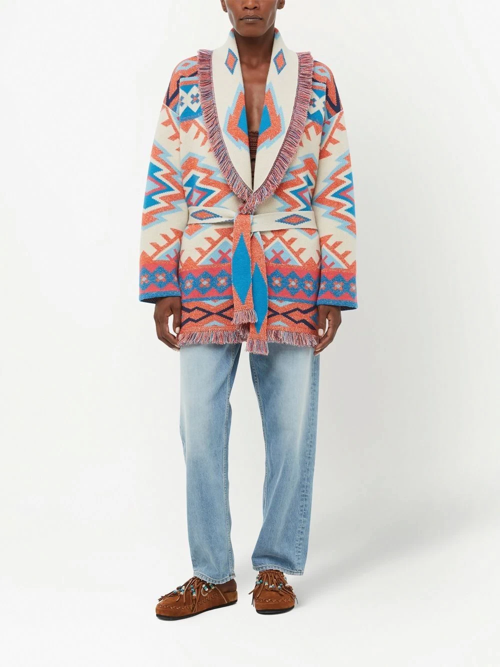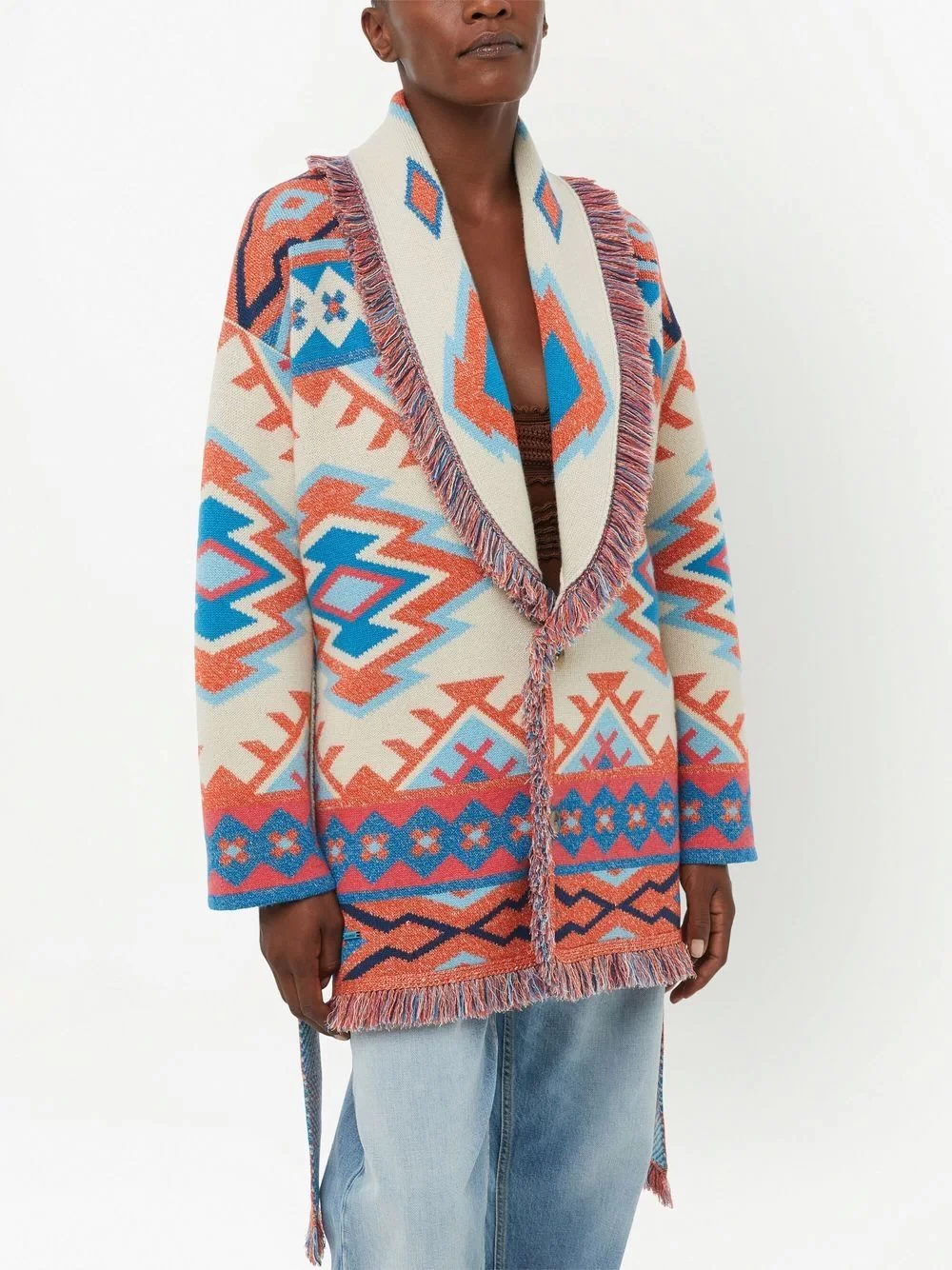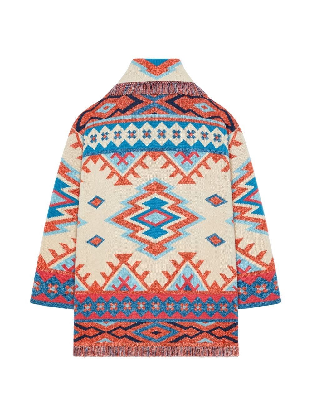 Oasis geometric-pattern-print cardigan from ALANUI featuring ecru, multicolour, cashmere blend, geometric-pattern print, patterned jacquard, knitted construction, shawl lapels, belted waist, long sleeves and fringed edge.