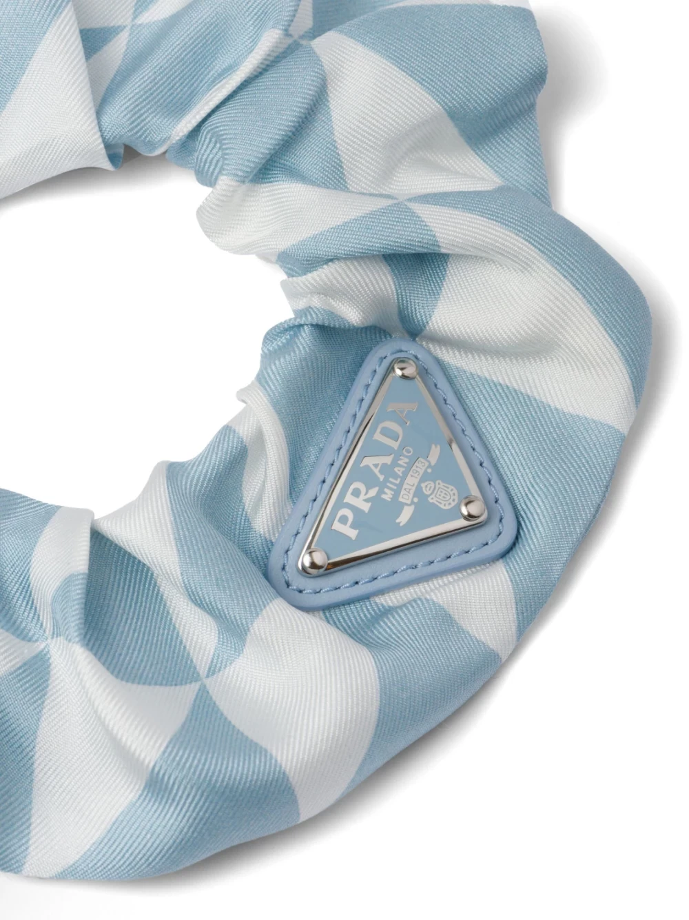 logo-plaque hair scrunchie from PRADA featuring light blue, geometric print, enamel triangle logo, tonal logo plaque and elasticated band.