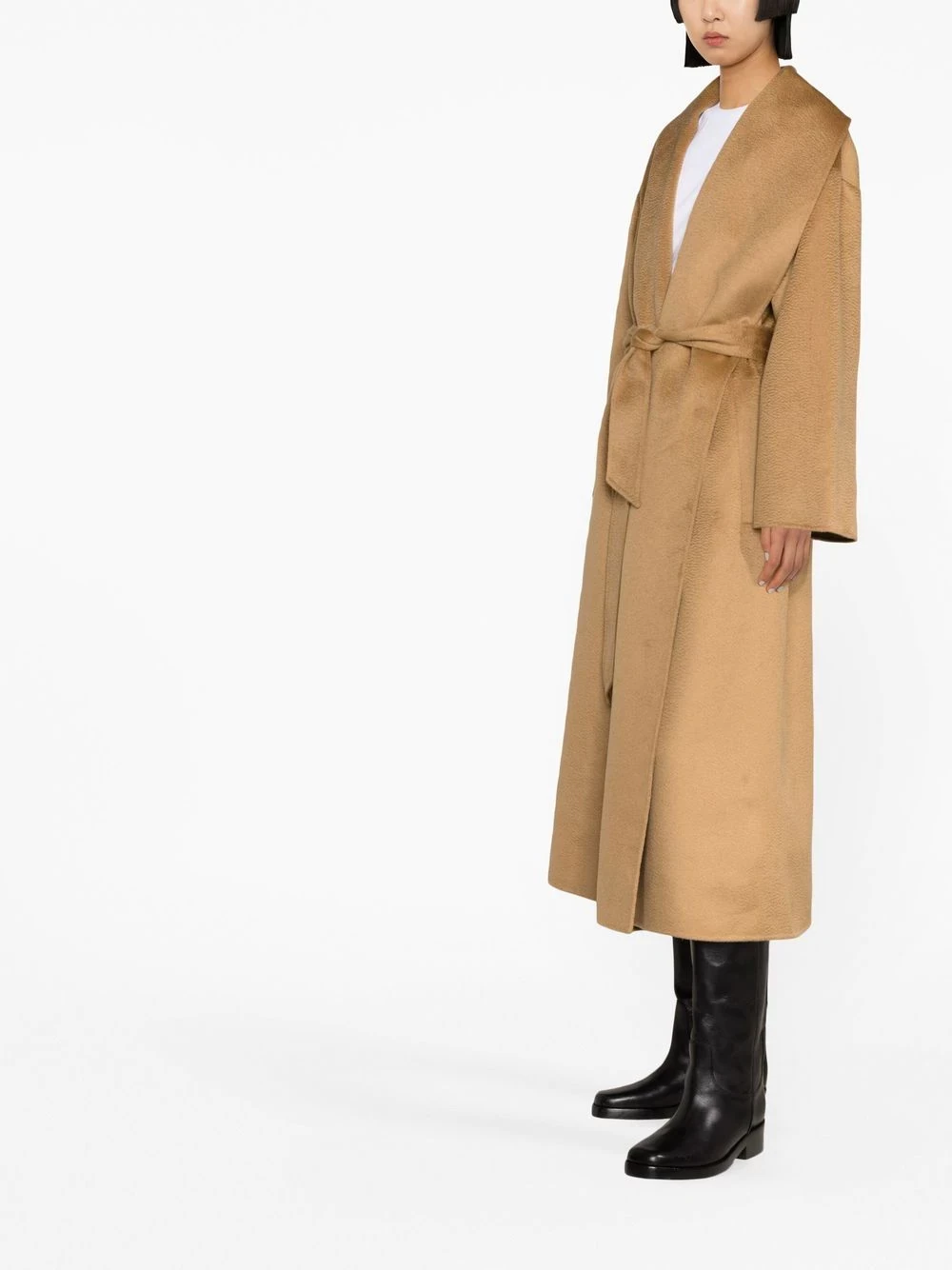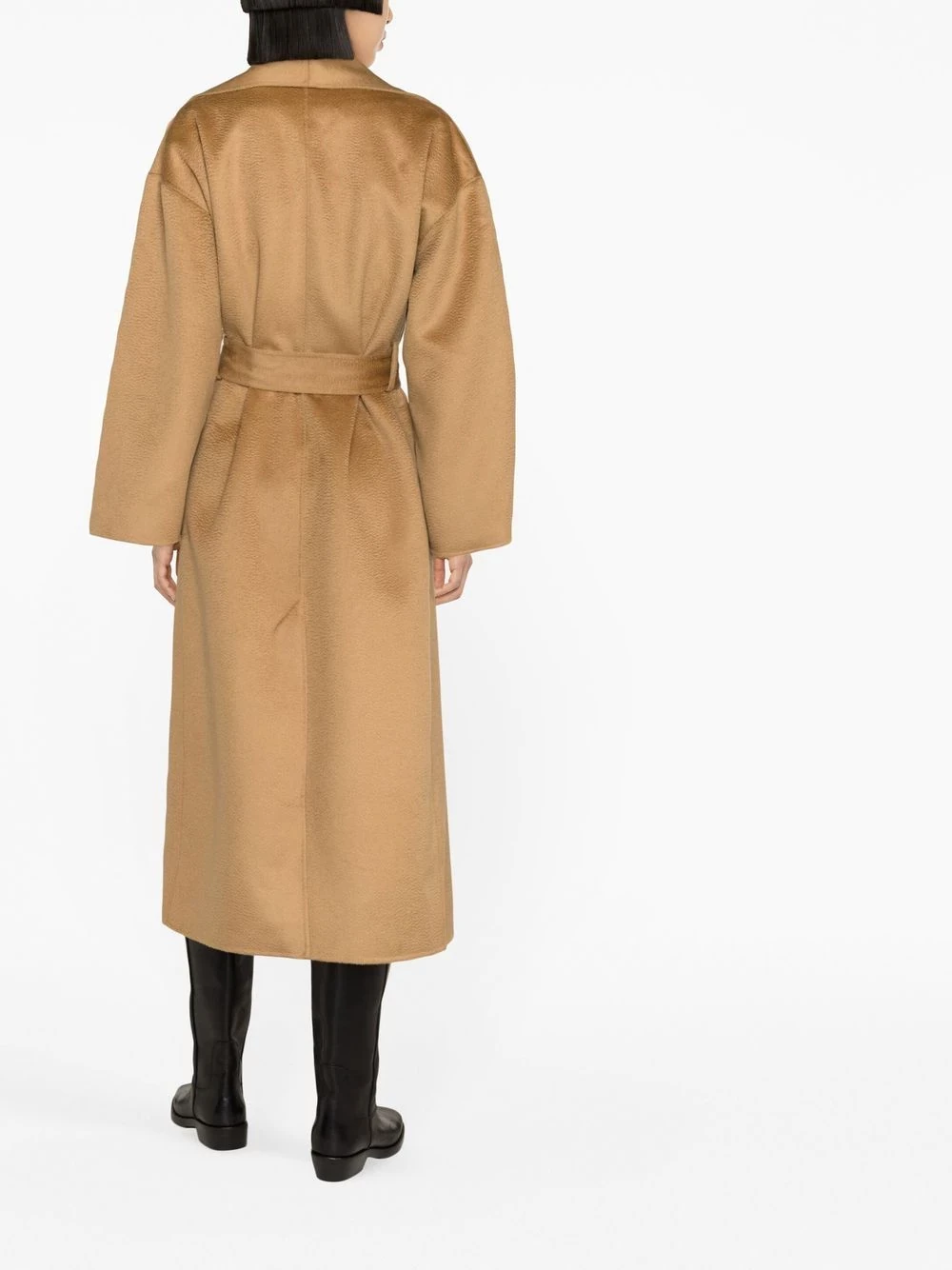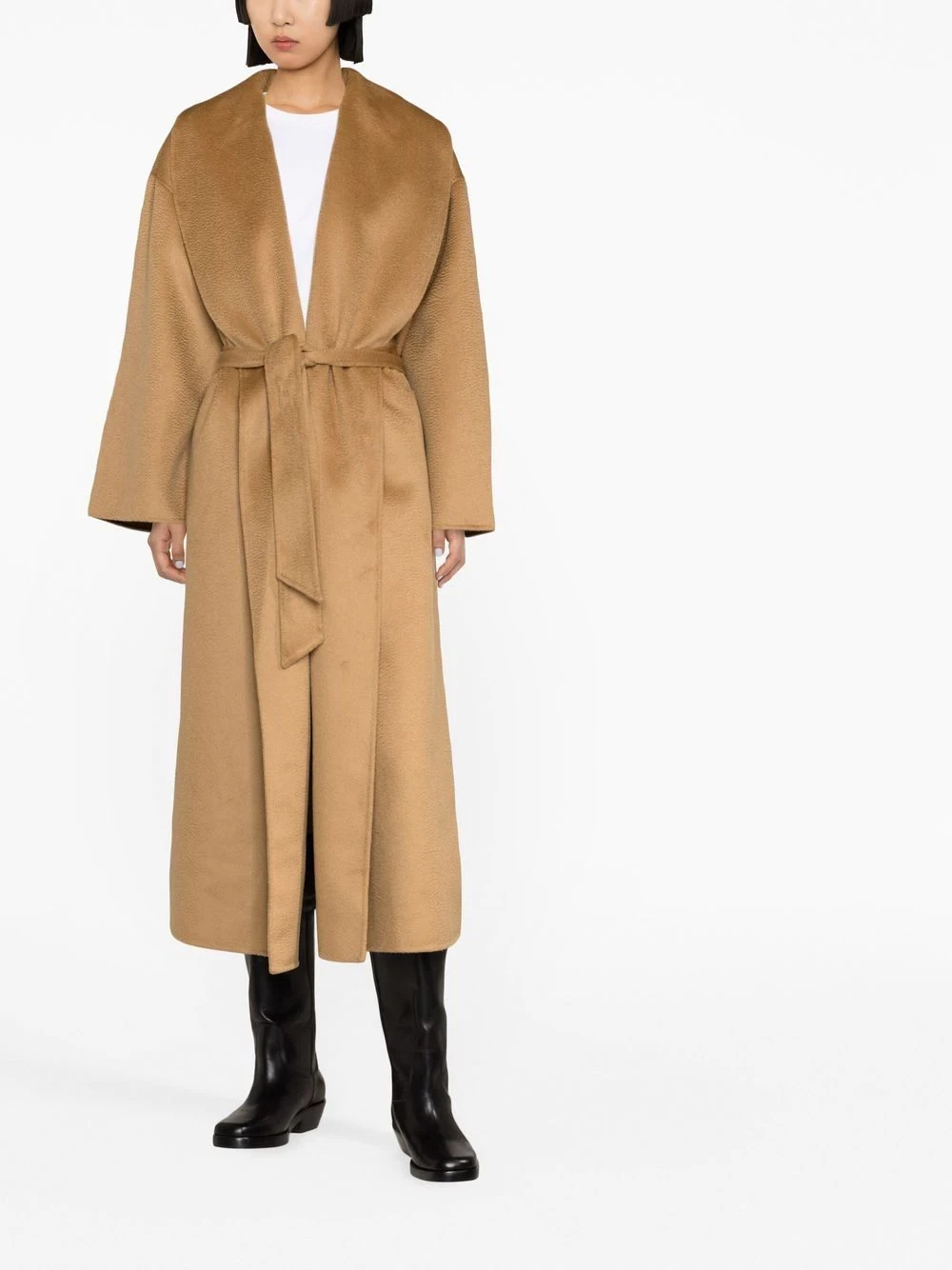 updates a classic silhouette with the Rebeca coat. The wool construction plays host to an alluring camel brown hue and features a tied waist while the oversized shawl lapels take centre stage for a striking finish.