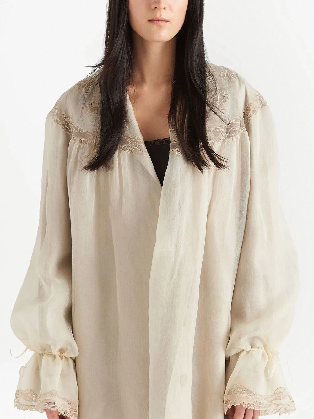 Combining a Panama cotton coat with a menswear design and an overlay adorned with delicate lace trims, this single-breasted coat from Prada's SS23 collection is rendered in a cream colourway for a timeless finish.