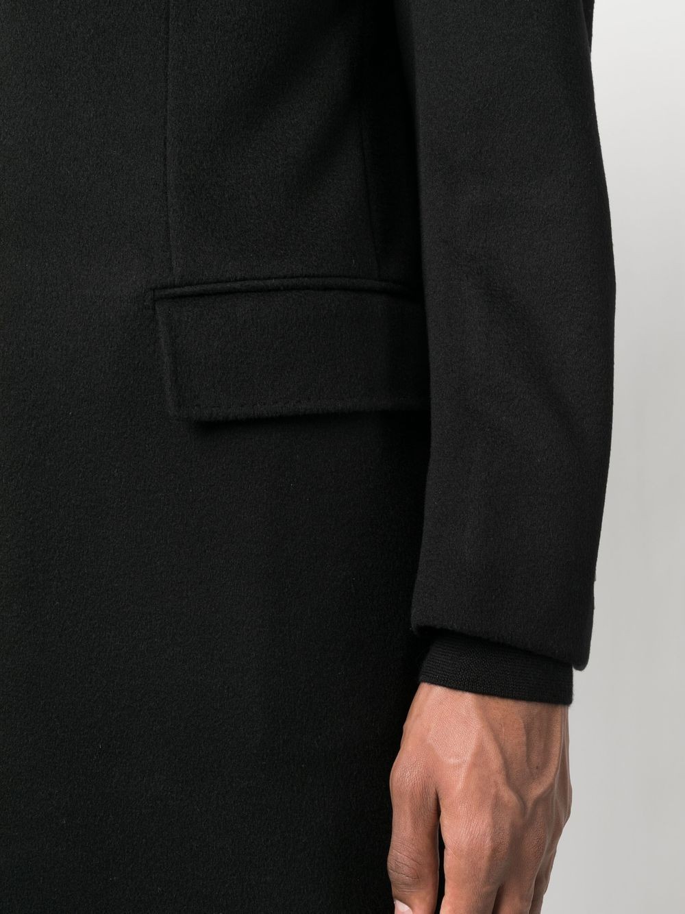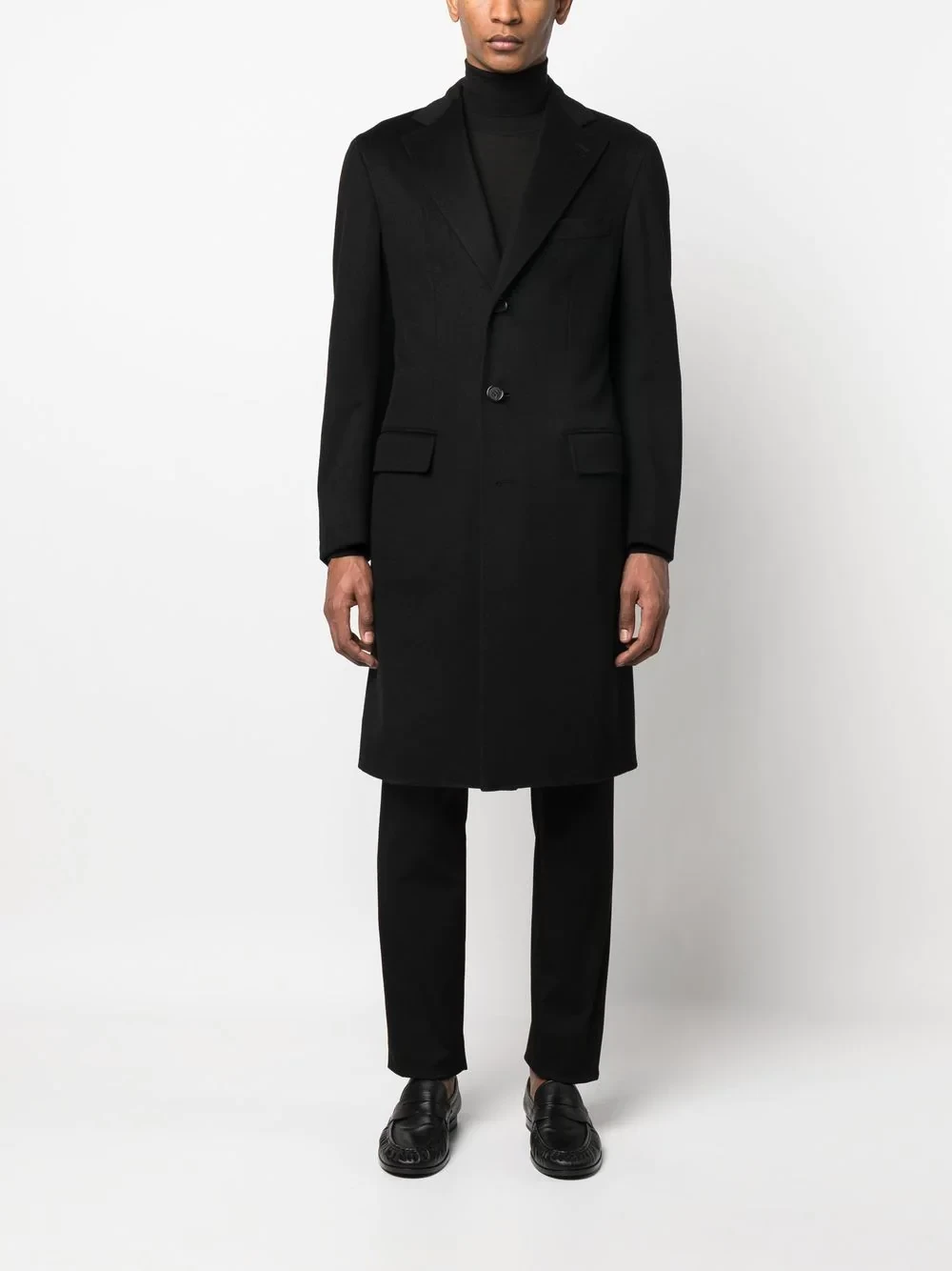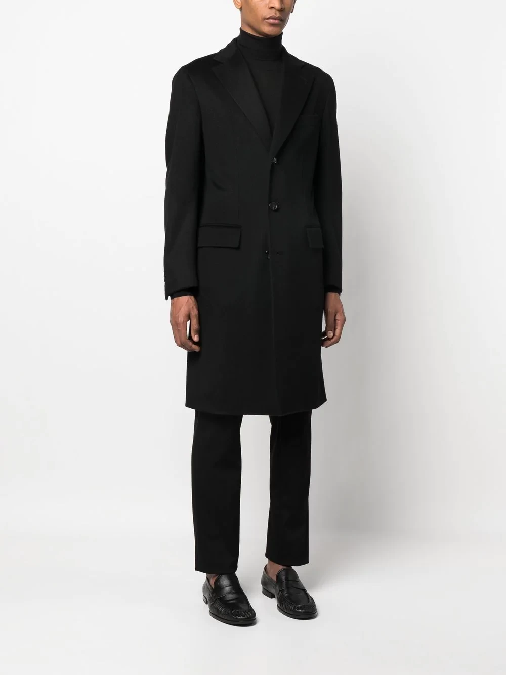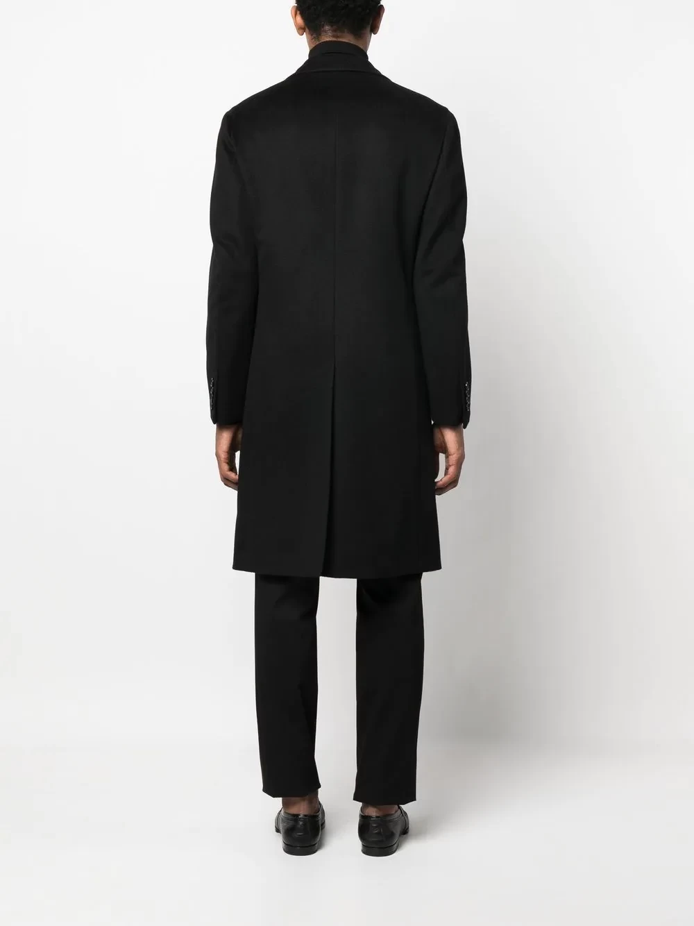 Solferino cashmere coat from BRIONI featuring black, cashmere, notched lapels, front button fastening, long sleeves, chest welt pocket and two front flap pockets.