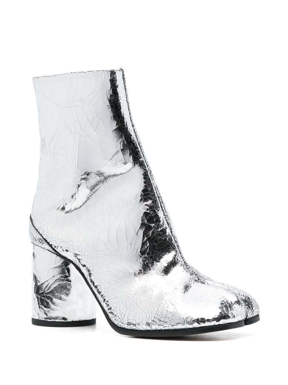 Tabi metallic ankle boots from Maison Margiela featuring silver, calf leather, metallic effect, cracked effect, signature Tabi toe, branded insole, high block heel and ankle-length.
