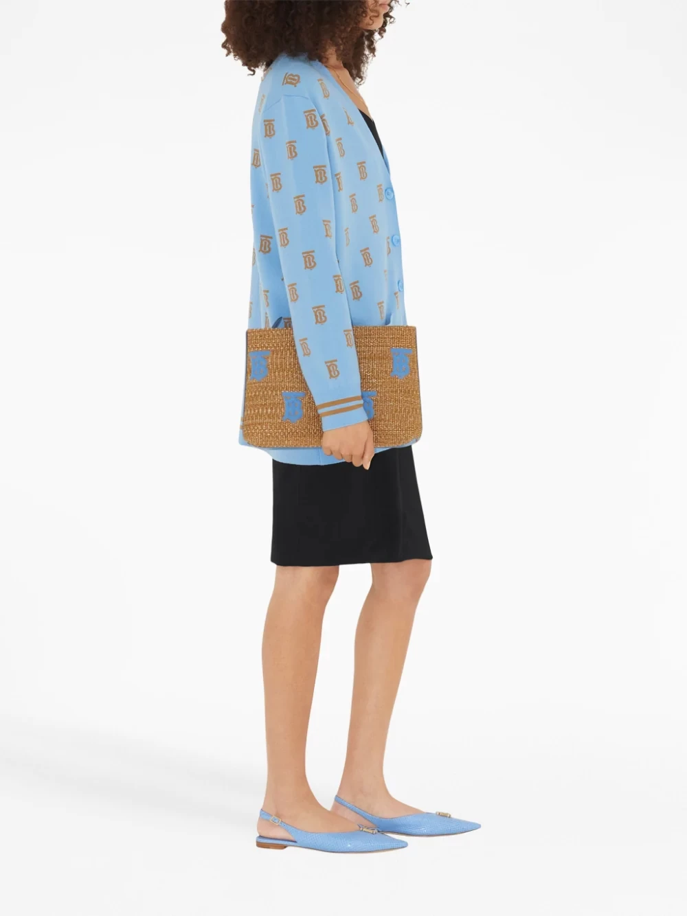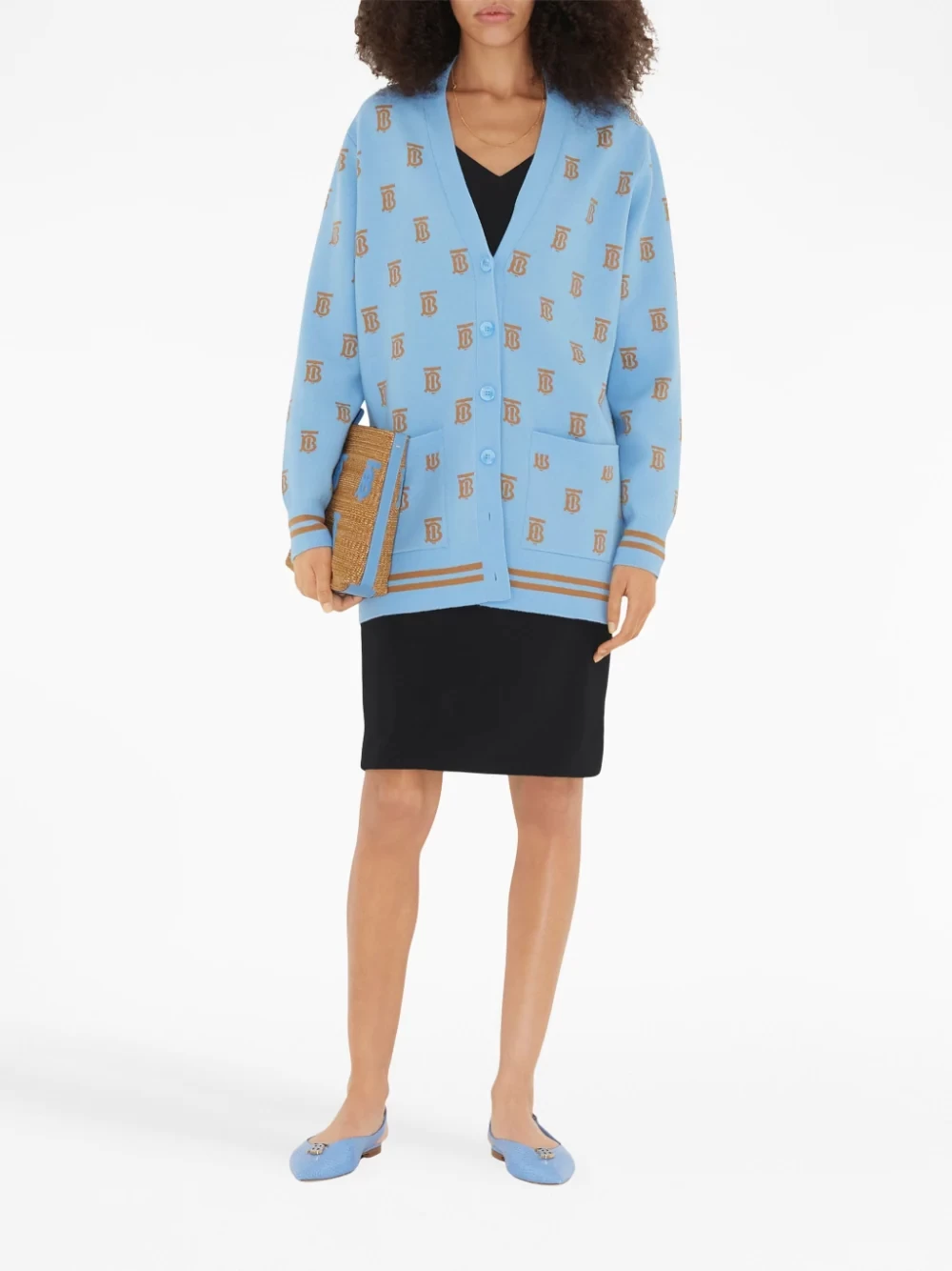 TB monogram-patterm knit cardigan from BURBERRY featuring signature TB monogram pattern, two front patch pockets, sky blue, wool, silk, V-neck, front button fastening and long sleeves.