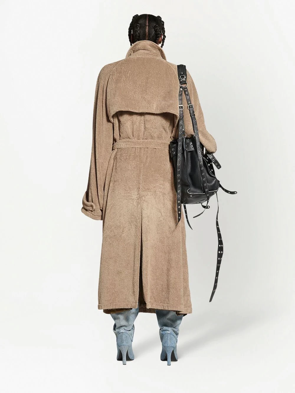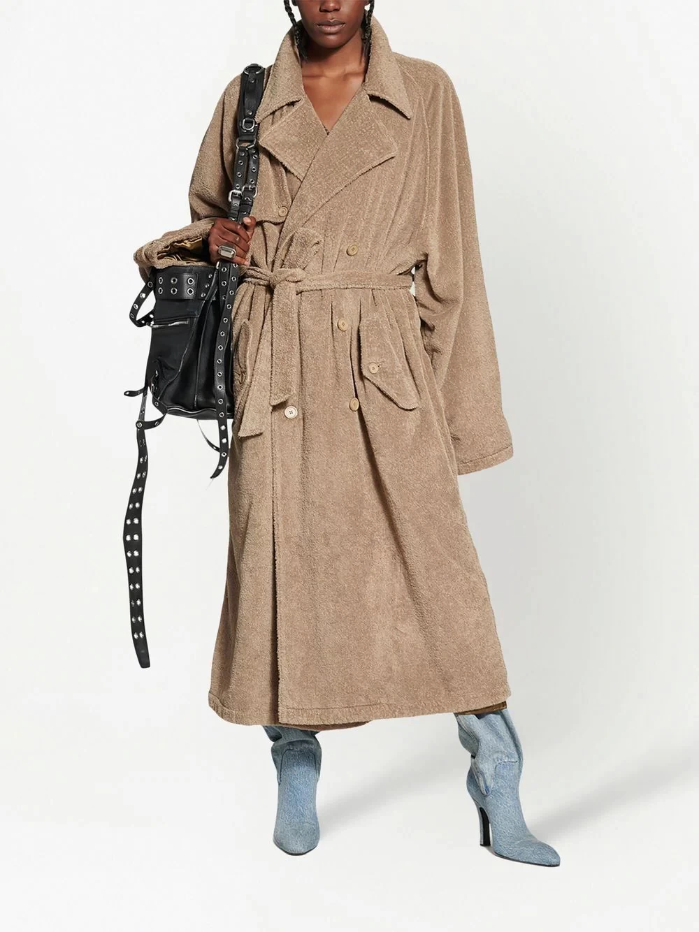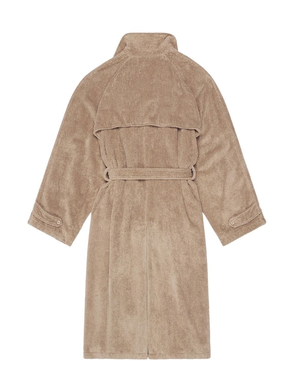 sand beige cotton towelling finish notched lapels storm flap double-breasted button fastening belted waist two side flap pockets long raglan sleeves central rear vent Conscious: We've partnered with Good On You – an ethical agency that rates how sustainably brands perform. This item comes from a brand that performs well in relation to their impact on the planet.