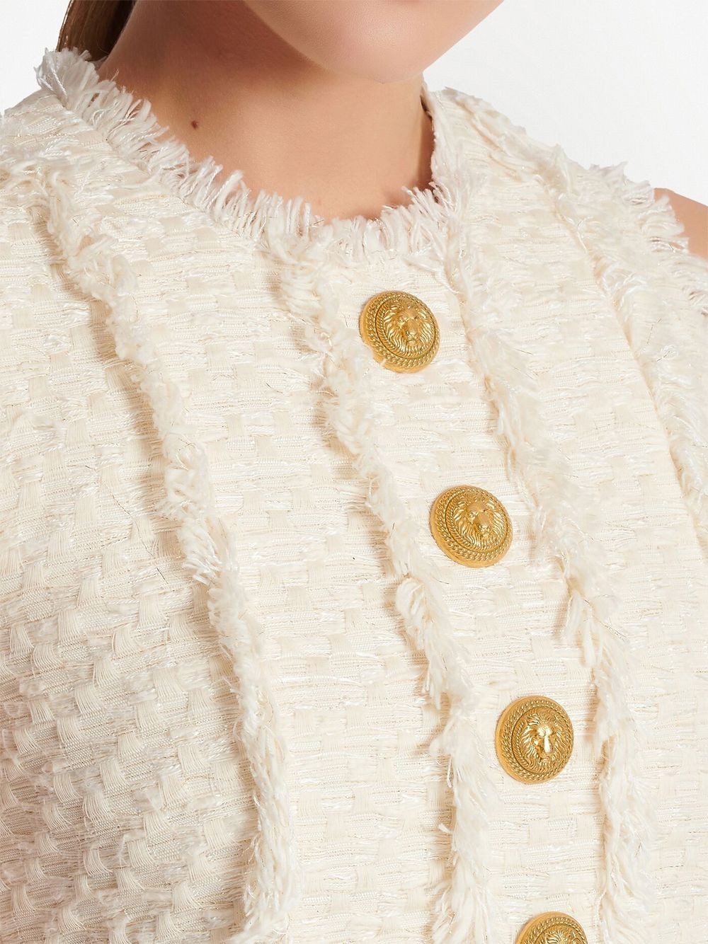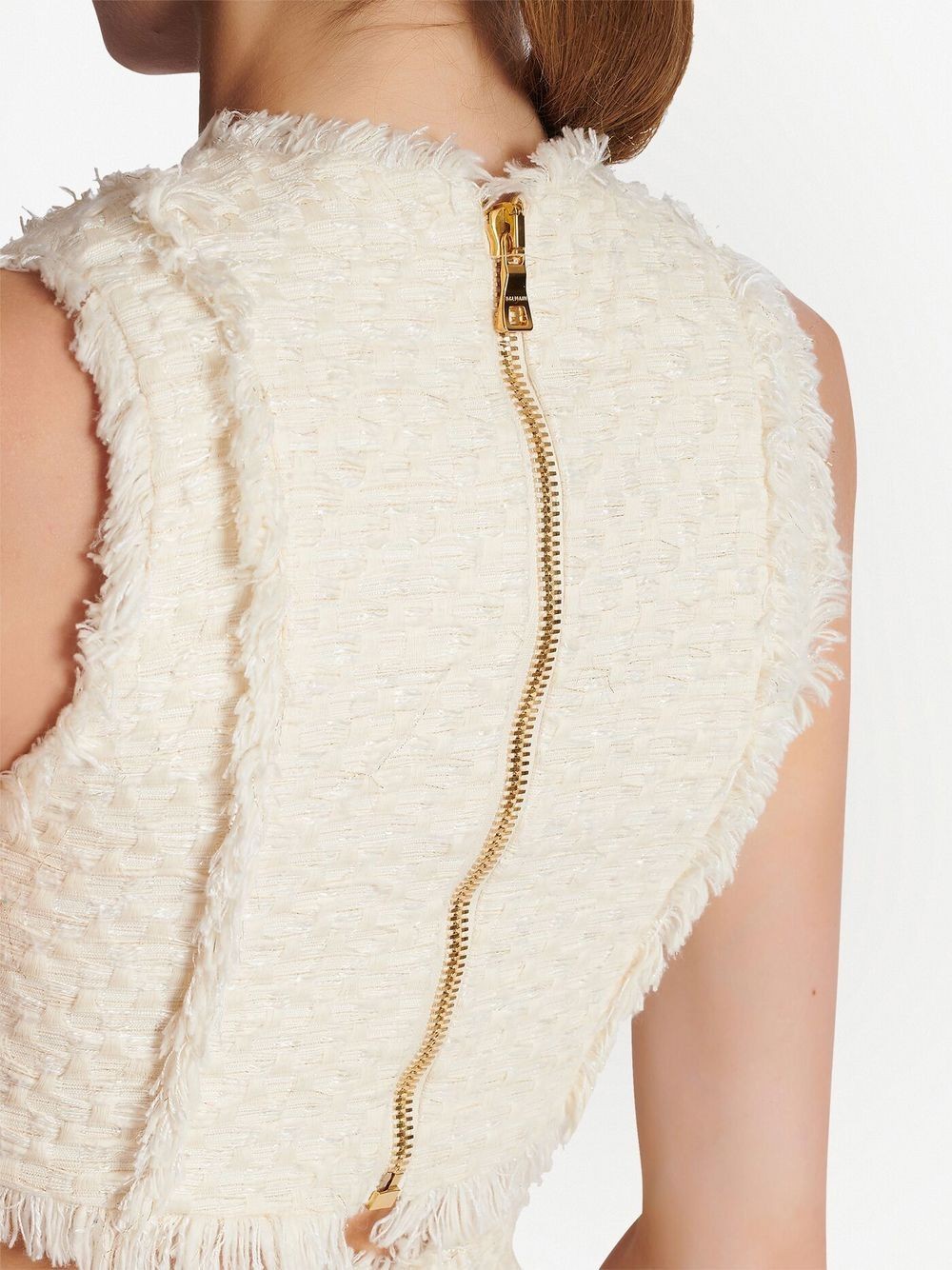 tweed cropped top from Balmain featuring white, cotton blend, tweed, frayed edge, crew neck, rear zip fastening, sleeveless and cropped.