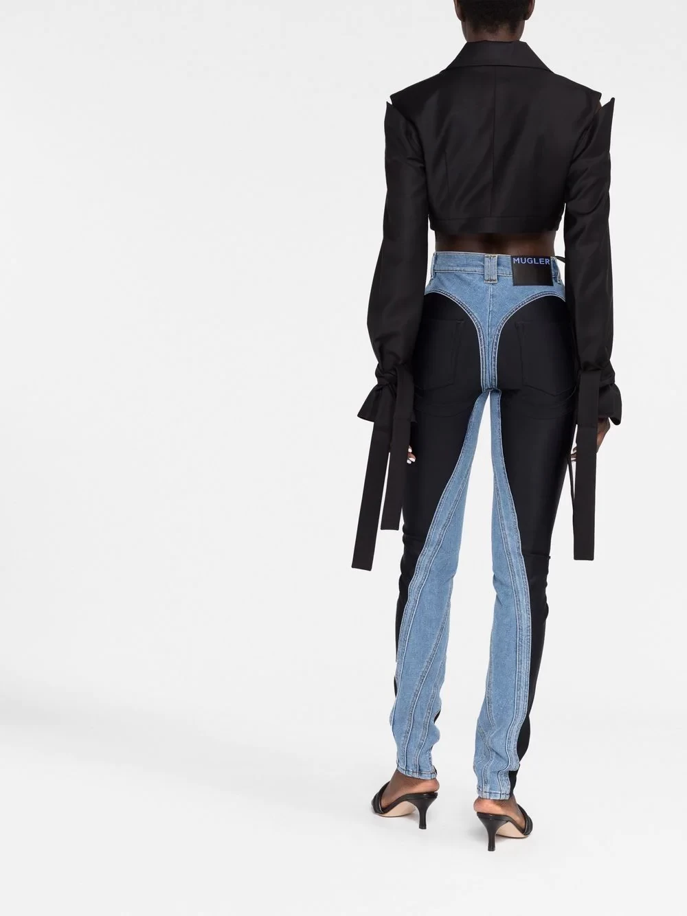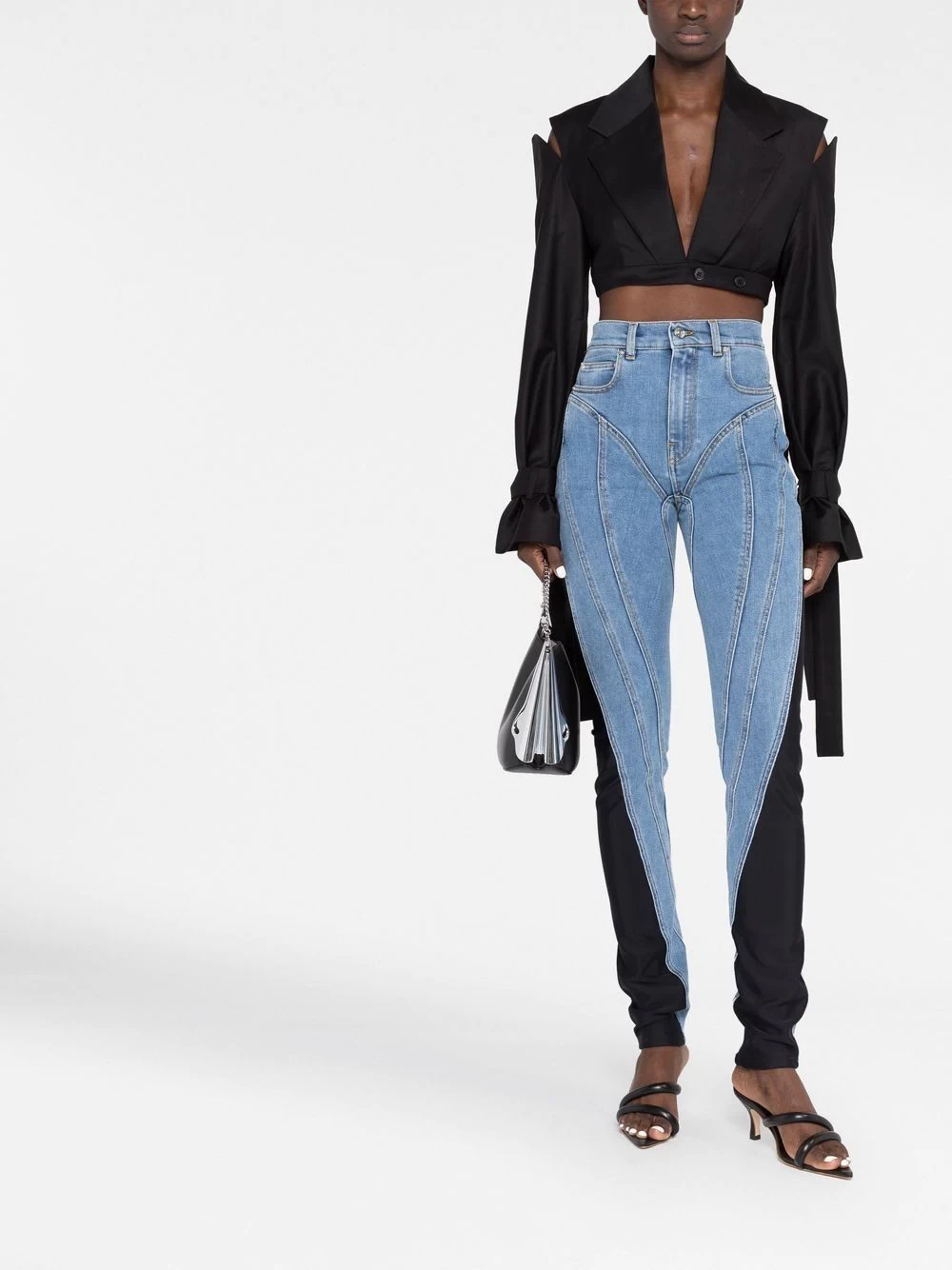 Mugler's focus on silhouette and form is front and centre in the design of these high-waist jeans. Combining the classic blue cotton denim construction with contrasting stretch design panels, the uniquely twisted silhouette draws the eye to the fitted nature of the pair.