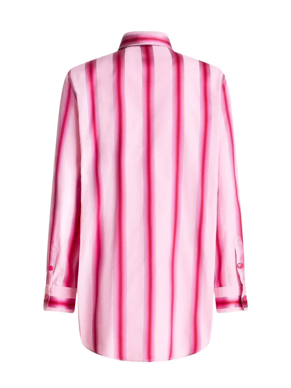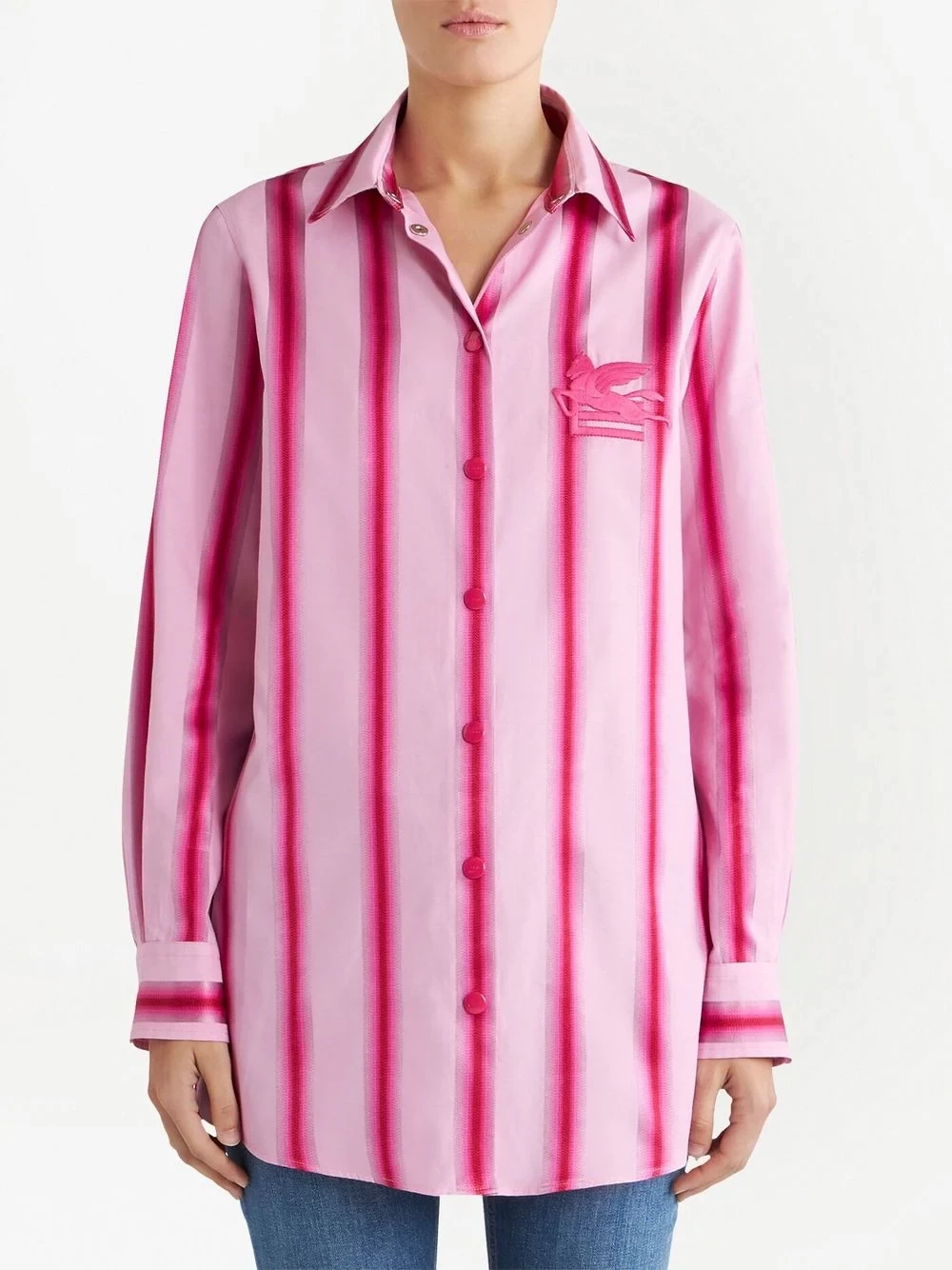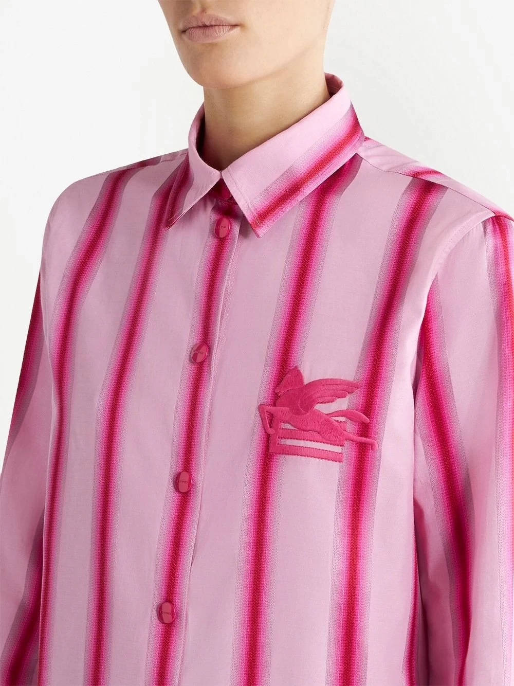 vertical stripe-print shirt from ETRO featuring logo patch at the chest, hot pink, silk-cotton blend, stripe print, classic collar, front button fastening and long sleeves.