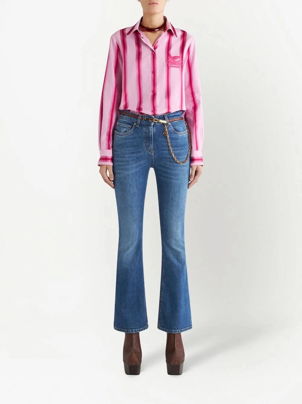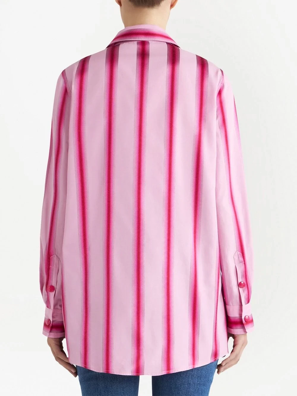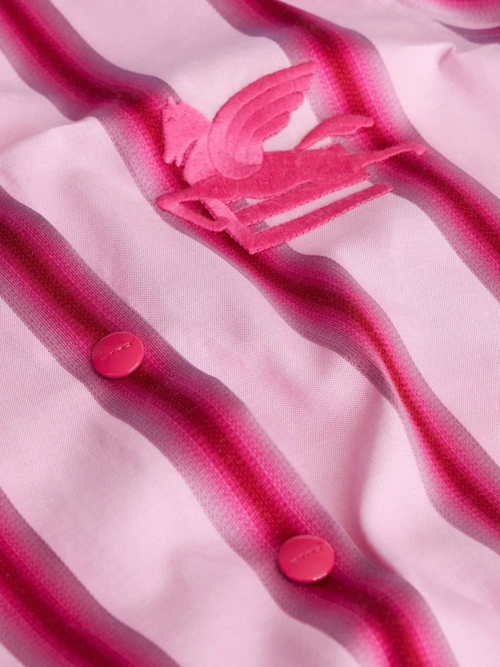 vertical stripe-print shirt from ETRO featuring logo patch at the chest, hot pink, silk-cotton blend, stripe print, classic collar, front button fastening and long sleeves.