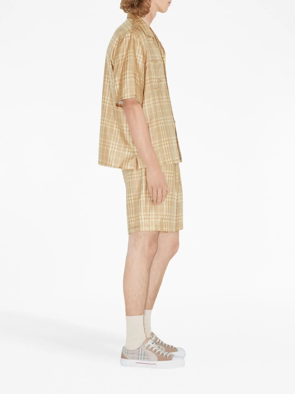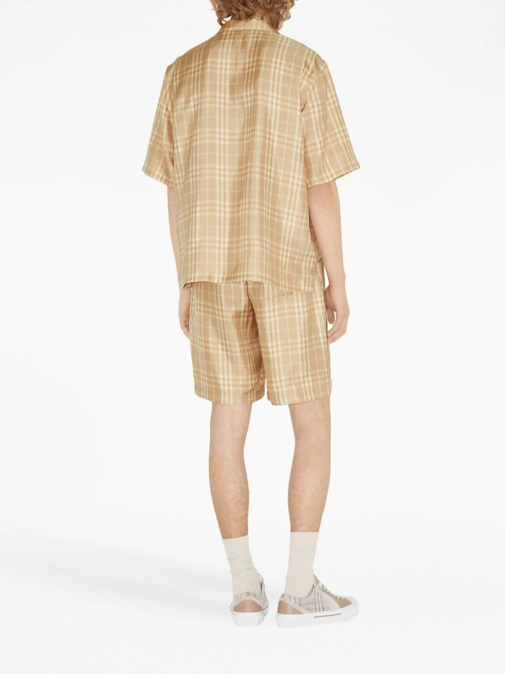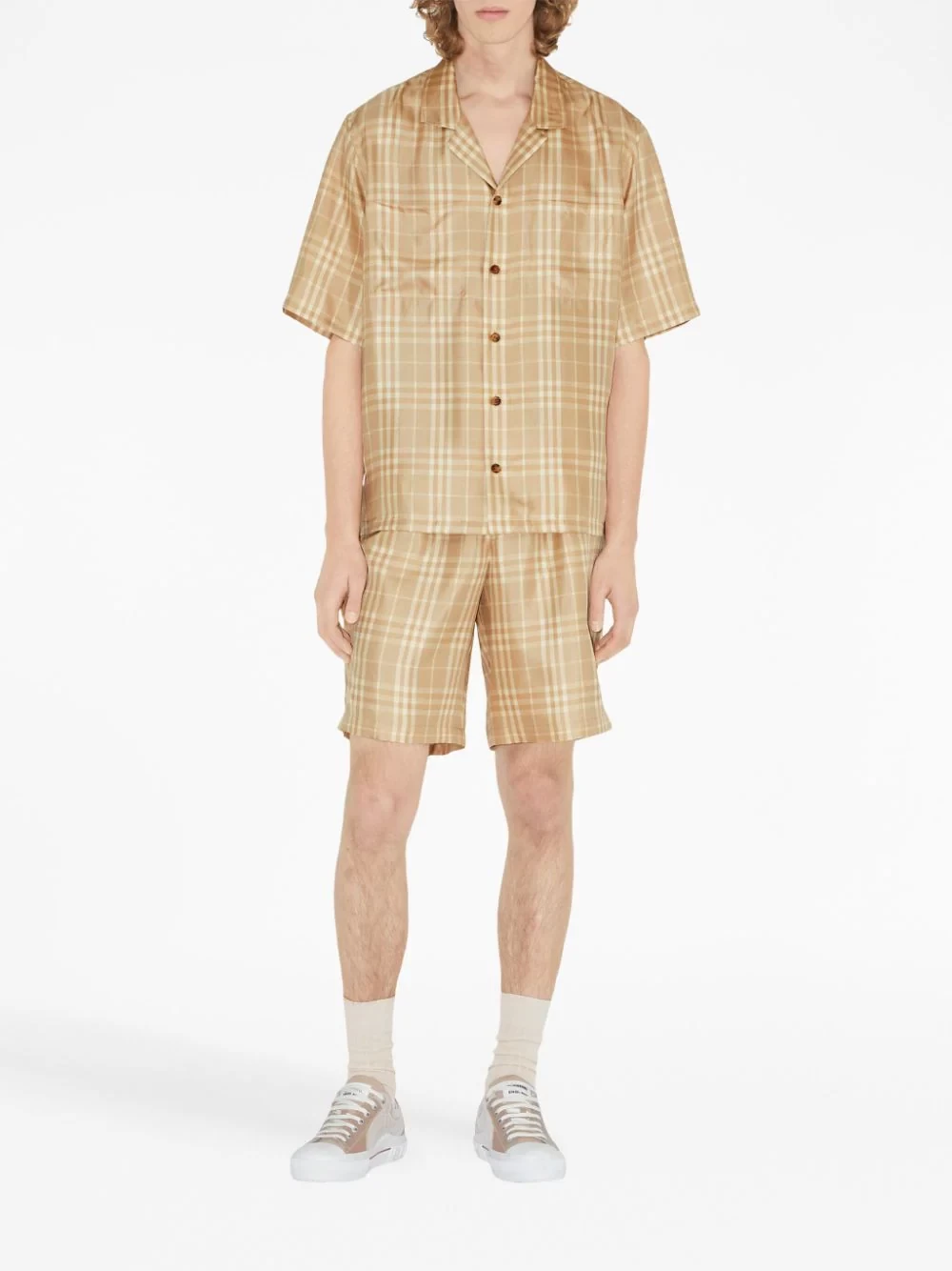 Vintage-check print pyjama shirt from BURBERRY featuring Vintage Check pattern, two chest patch pockets, soft brown, silk, spread collar, front button fastening and short sleeves.