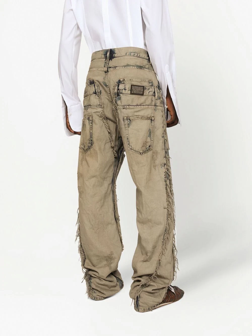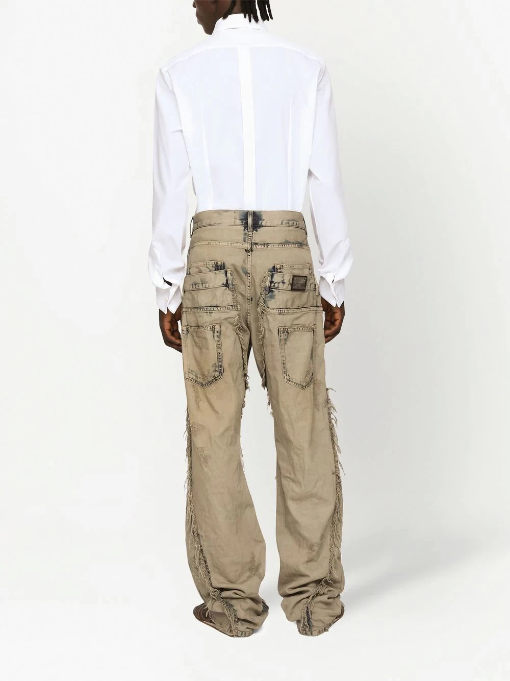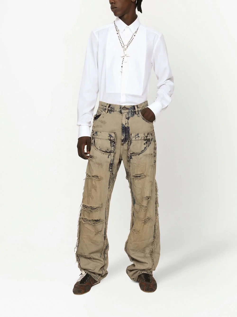 washed deconstructed jeans from DOLCE & GABBANA featuring beige, cotton, denim, washed, deconstructed design, ripped detailing, concealed fly and button fastening, belt loops, classic five pockets and straight leg.