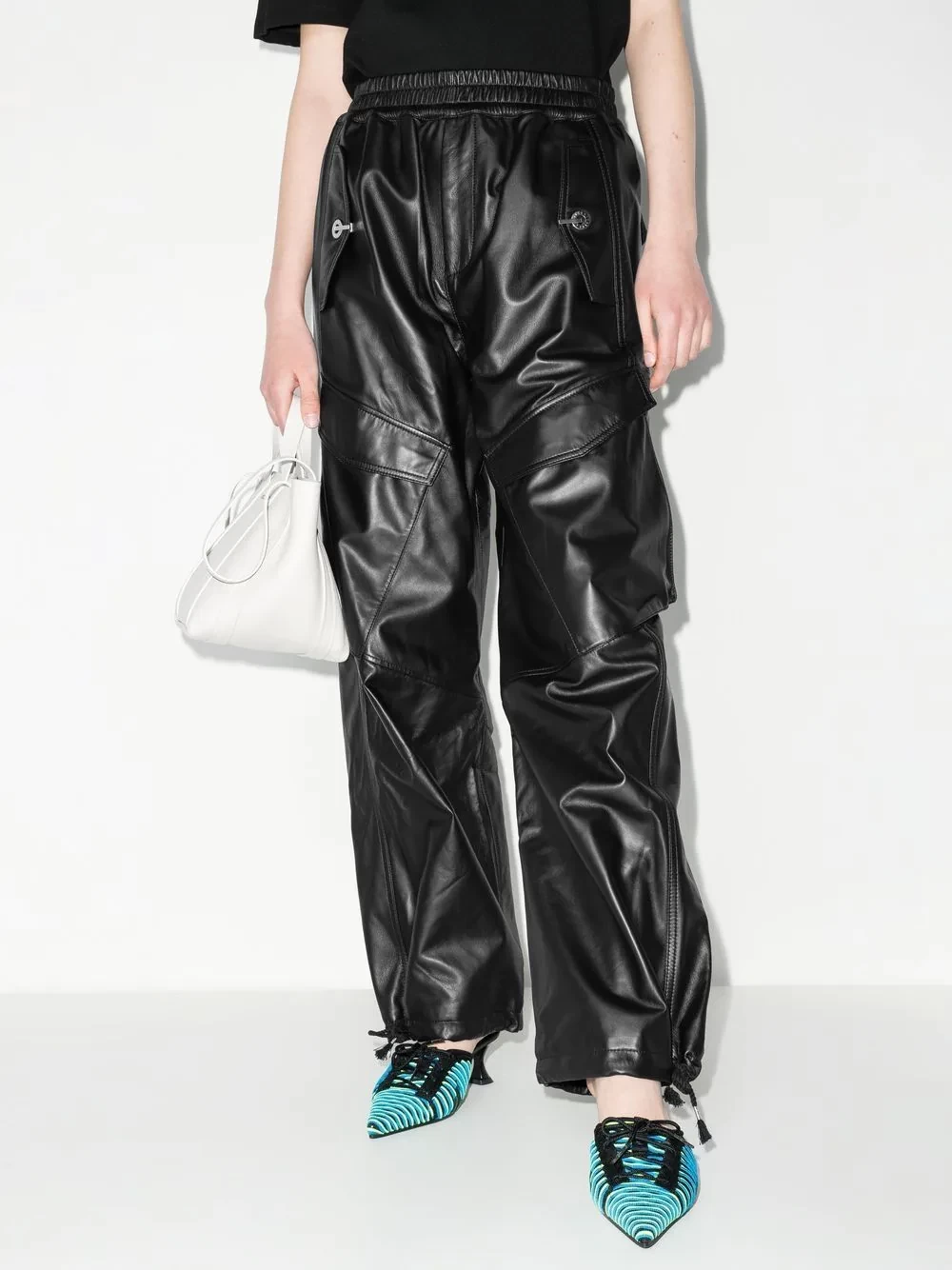 wide leg leather trousers from DION LEE featuring elasticated waistband, two side cargo pockets, wide leg, black and leather.