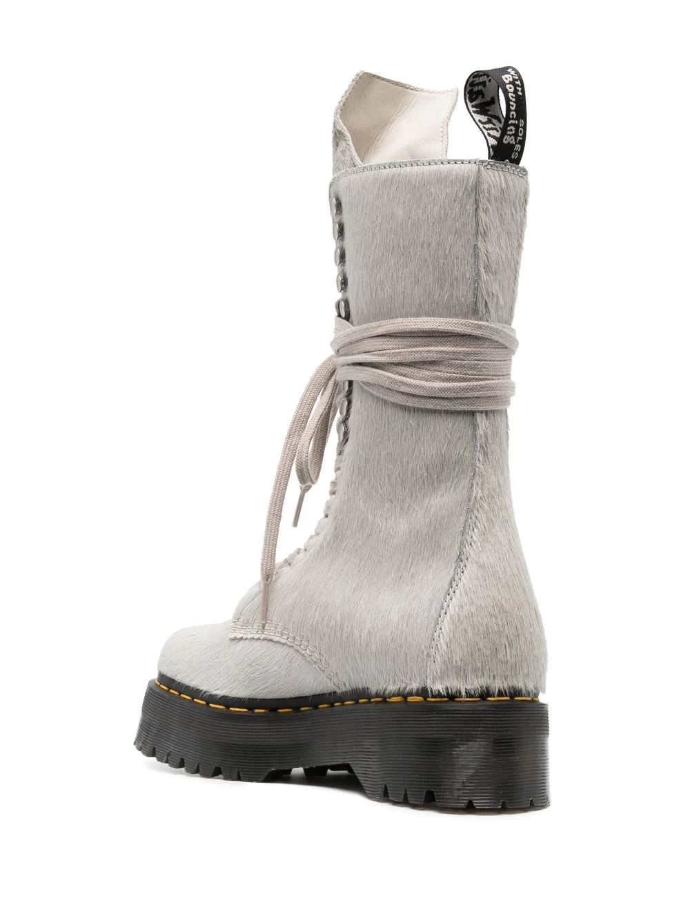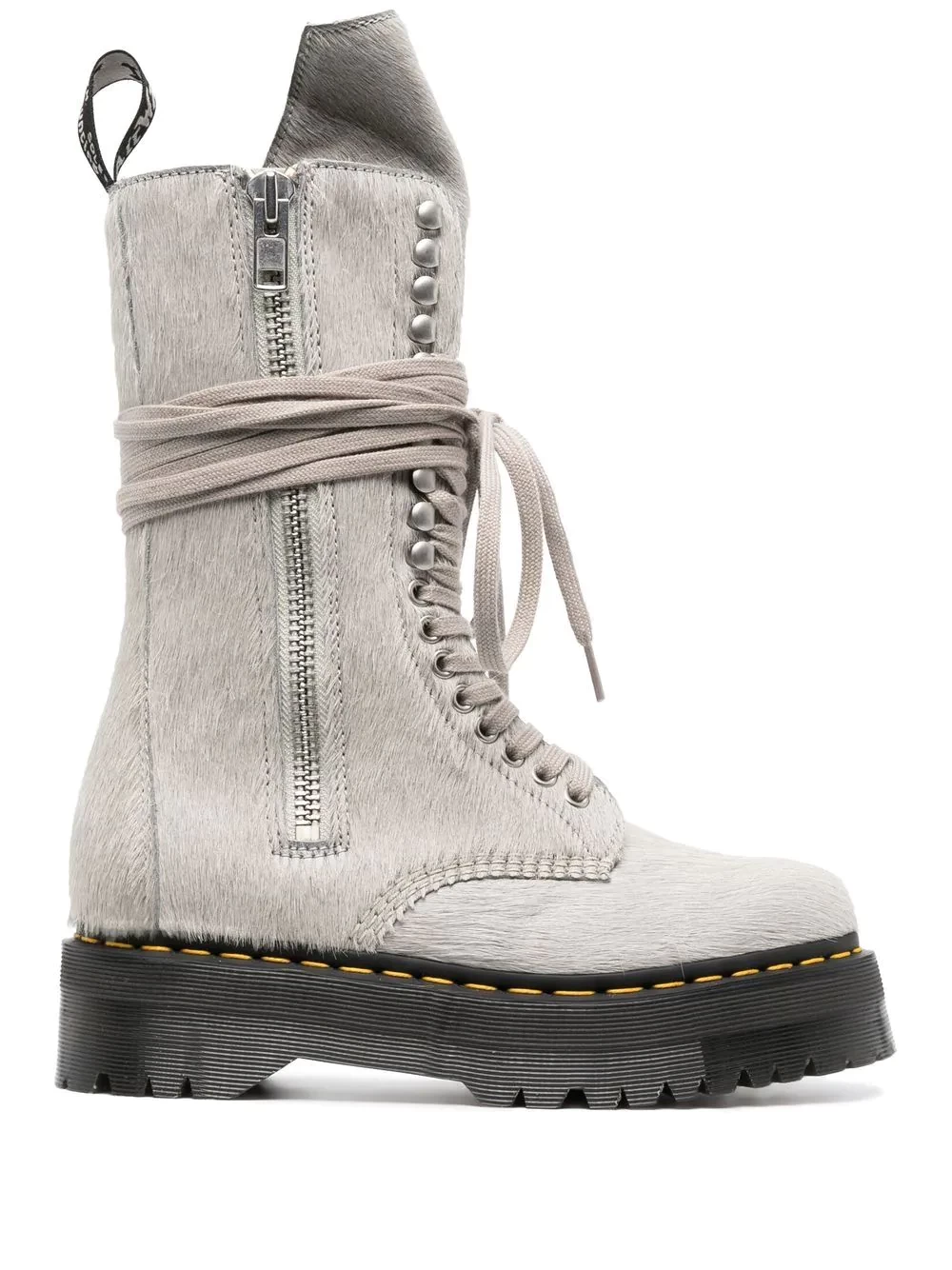 x Dr Martens calf-hair quad-sole boots from Rick Owens featuring grey, calf hair, calf leather, round toe, front lace-up fastening, logo pull-tab at the heel, side zip fastening and flatform sole.